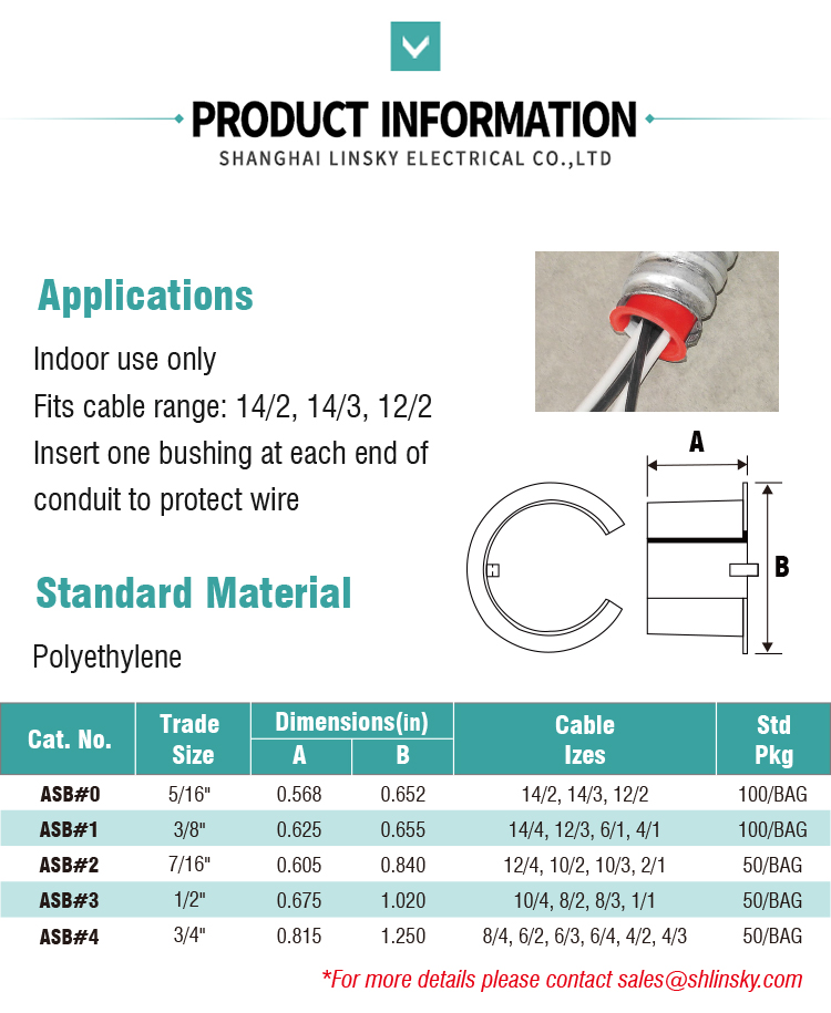 Our Anti-Short Bushing is a professional wire protection electrical fitting designed for AC and FMC flexible metal conduit wiring systems. Produced by LINSKY Electrical, the product has obtained ETL Listed certification from Intertek, with three available sizes including ASB#1, ASB#2 and ASB#3. The open split structure is specially made for convenient construction and all-around wire protection in indoor electrical engineering.