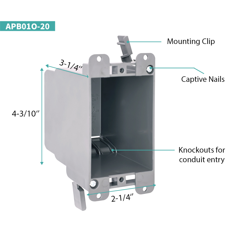 LINSKY APB120N is a 20 cubic inch 1-gang nail-on non-metallic new work plastic box, designed for applications requiring increased internal wiring capacity. Featuring a 3-1/4" depth and four knockouts, it accommodates bulkier cables, additional devices, or moderately complex wiring configurations while maintaining a standard 1-gang faceplate footprint for seamless compatibility with standard wall plates. The captive nail mounting ensures secure stud attachment, and the non-metallic plastic construction delivers corrosion resistance and enhanced safety by eliminating metal contact risks. ETL listed with a 2-hour fire rating, this box is suitable for new work residential and light commercial installations using non-metallic sheathed (NM) cable.
