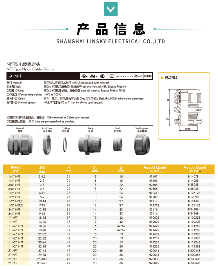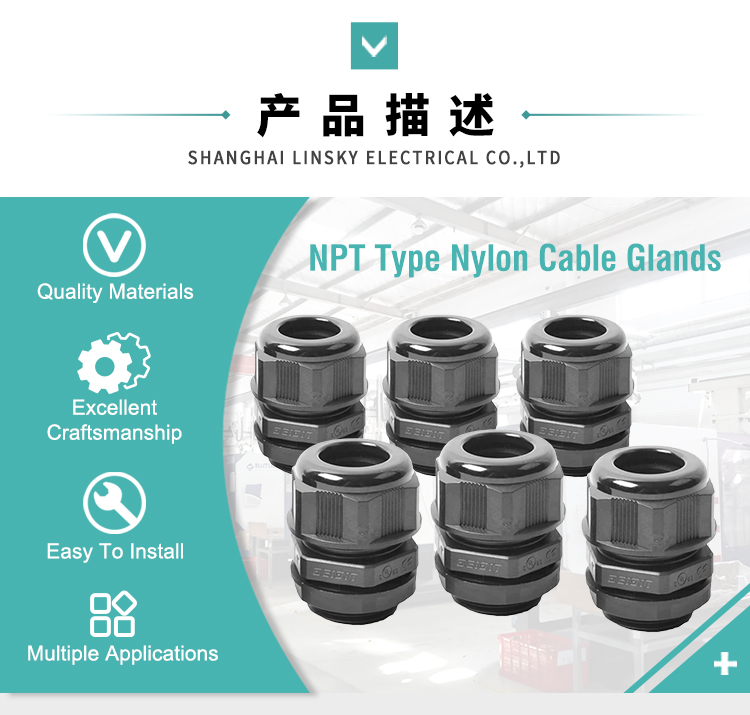 This NPT Type Nylon Cable Gland is a high-performance solution for fixing, sealing, and protecting electrical cables and wires. Made of UL-recognized nylon material, it ensures excellent mechanical strength, insulation, and corrosion resistance, making it ideal for industrial, commercial, and outdoor electrical applications.