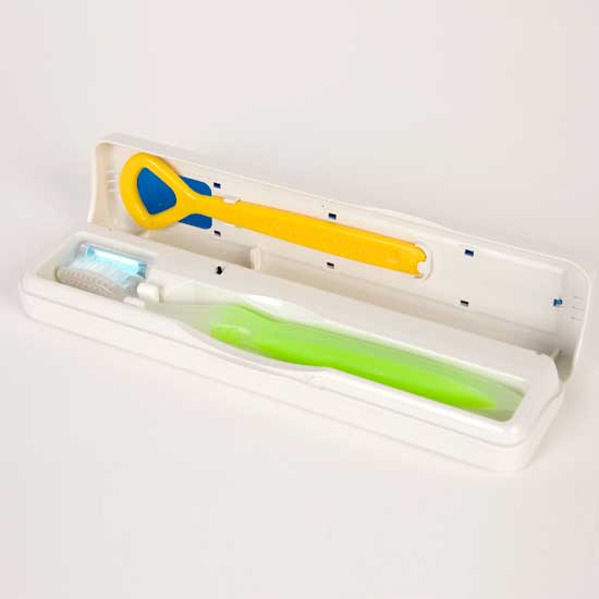 The UV toothbrush sterilizer features a UV and ozone lamp that sterilizes various viruses and pathogenic bacteria. The air vents discharge humid to the outside when a wet toothbrush is stored. The toothbrush holder holds the toothbrush firmly.