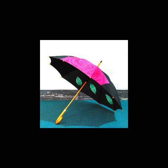 The fancy umbrella is in black with big rose design on the outer side and green leaves on inner side