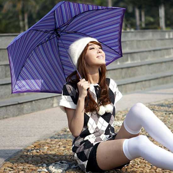 This ladies' umbrella flaunts a dashing design with horizontal stripes in different shades of purple. The compact design makes it easily portable and allows you to carry it wherever you go. Stay dry while looking good with this six-rib umbrella.