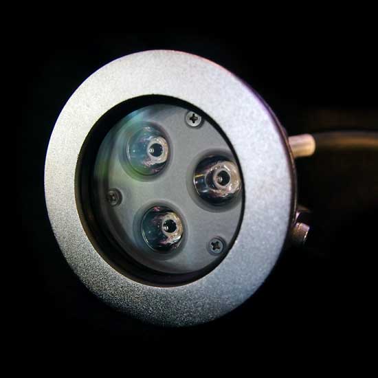 Displayed is a underwater light that comes in a simplistic design with three light source outputs. Made of stainless steel, this underwater light is durable and long-lasting. This light is easy to install and offers satisfactory illumination.