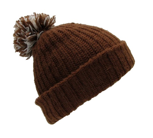 Free size knitted acrylic pom top stocking cap with roll back brim.