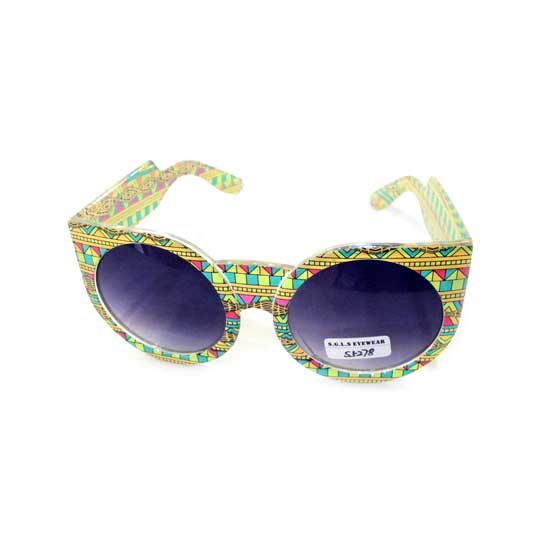 This pair of unisex sunglasses grabs your attention with its allover ethnic patterns in yellow, pink and green. It is fitted with dual round lenses to fend off the burning sunlight. This pair of chic plastic sunglasses is a must-have for going out on summer days.