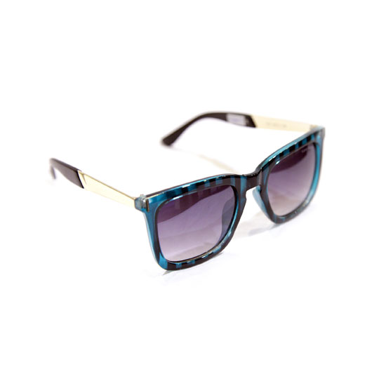 This is a pair of unisex sunglasses that comes in a Wayfarer style. Featuring blue rims with black stripes, these sunglasses are fashionable. The temples are thin and flat for a perfect fit.