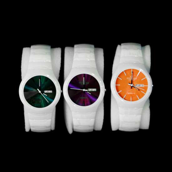 This is a series of unisex wristwatches that features a white ceramic band for a neat and clean appearance. The fancy dial face has three hands, a date display and precise hour markers. This unique quartz watch is an ideal addition to complete your watch box.
