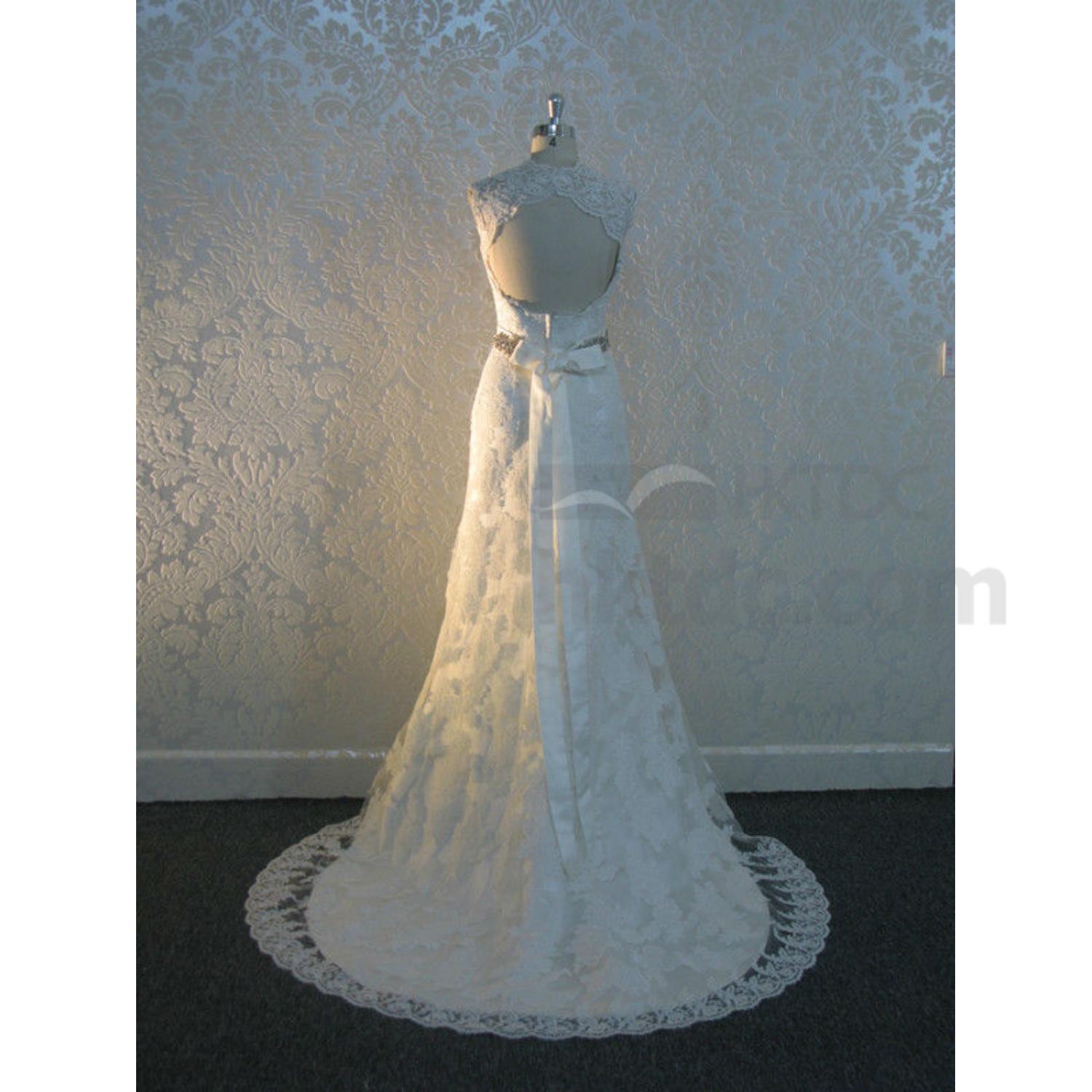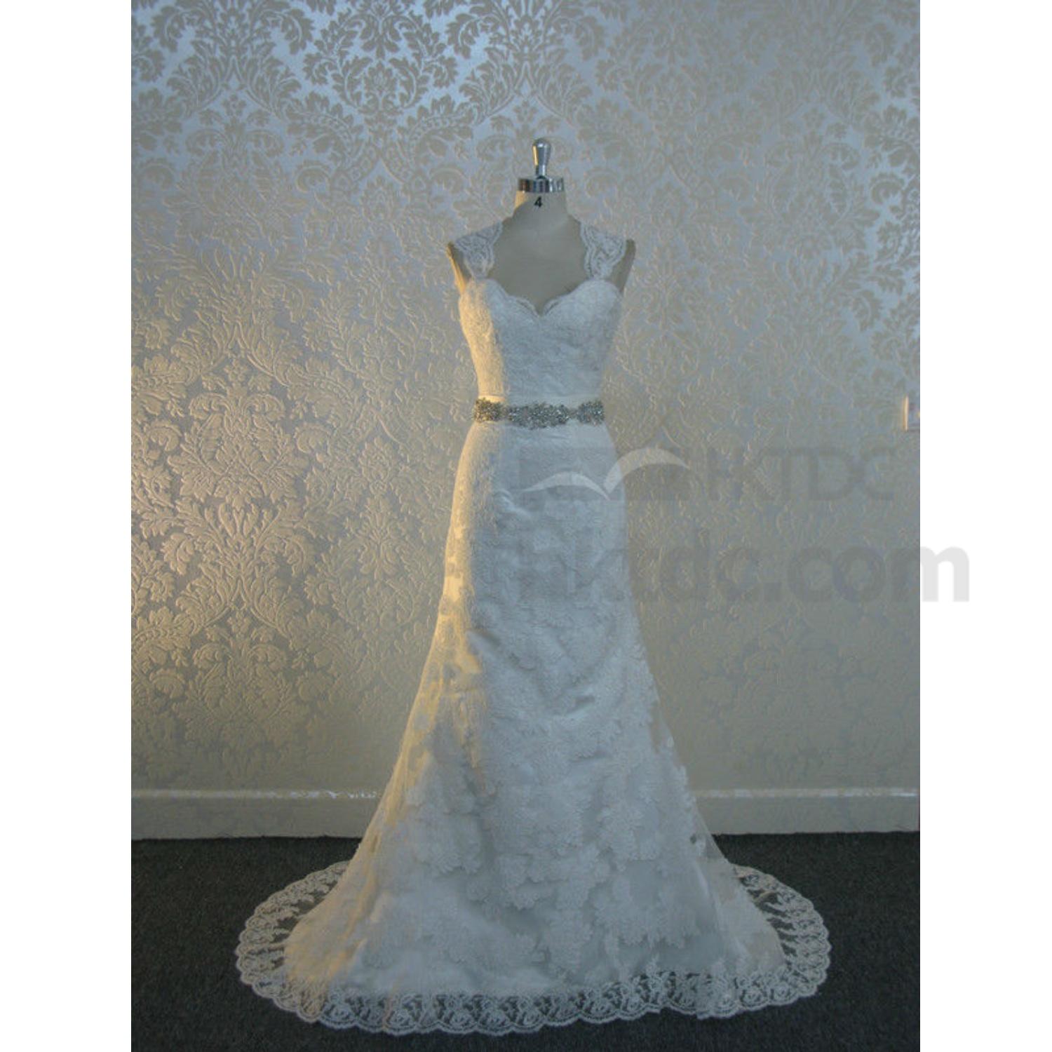 This is a V-neckline lace overlay beading waist A line bridal gown, it is made by high quality & finest fabric and perfect workmanship. It is very beautiful and fitted when brides wearing.