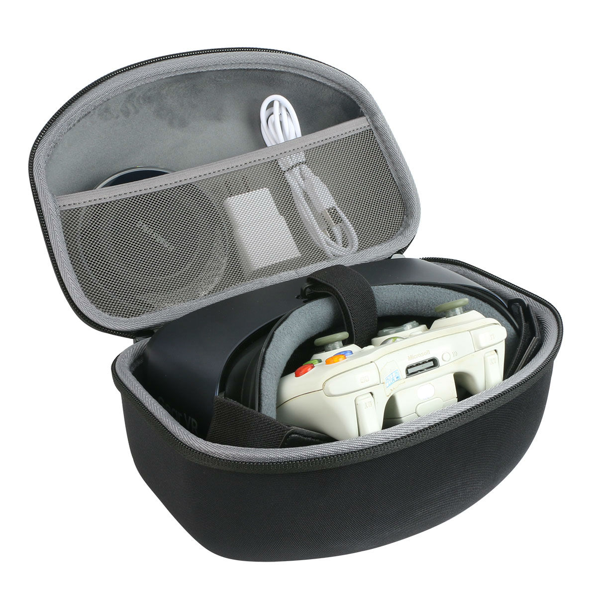 This storage case is designed for VR headset storage and has a large main compartment. It offers space for storing a VR headset, a gamepad and has a mesh pocket under the lid for storing small accessories. The storage case can keep the stored items safe from damage and is convenient to carry around.
