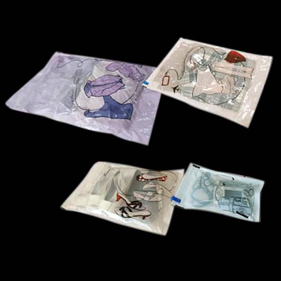 This is a set of roll-up vacuum storage bags which can be used to store different items, including clothes and shoes. They allow users to store their various personal items in a proper and organized way. Various types of bags are available in accomodate demands of different customers.