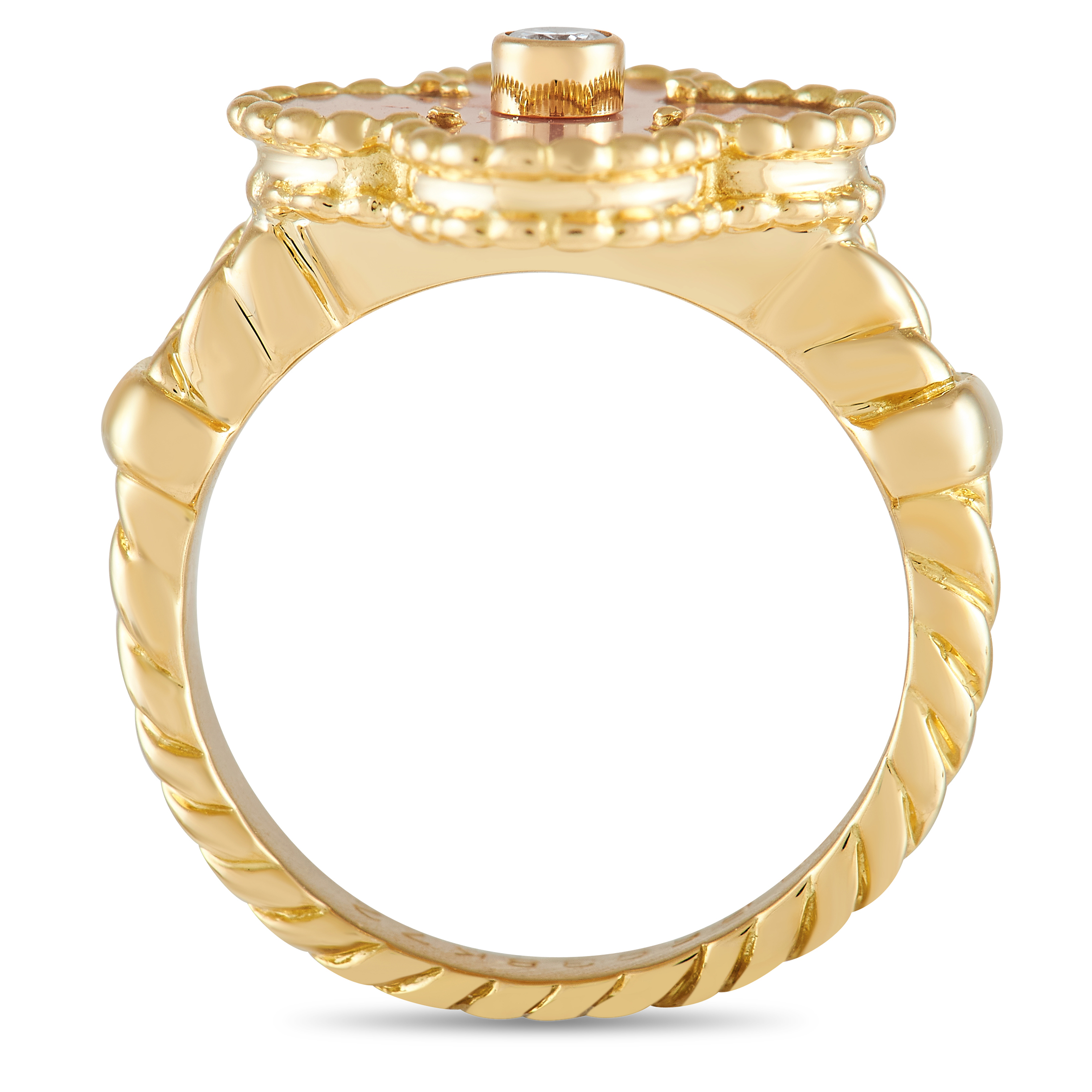 This exquisite Van Cleef & Arpels Alhambra ring features an opulent array of colors and textures. At the center, the brand’s iconic clover-shaped symbol comes to life thanks to the captivating Coral accent. The lustrous 18K Yellow Gold setting features a 3mm wide band and a 5mm top height.