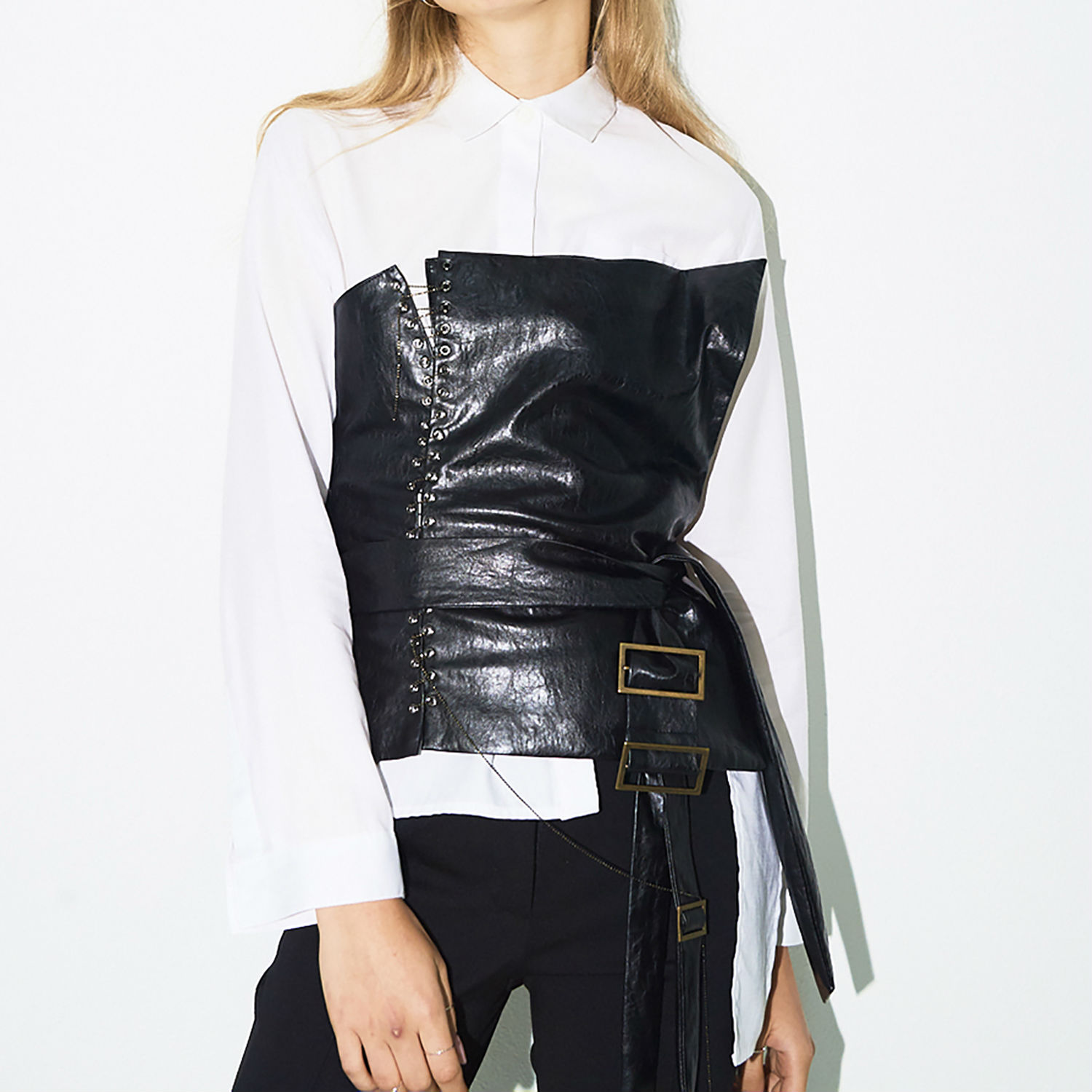 There is eyelet and chain details of the front side cut .This is the leather that will be the point. By using artificial leather like real leather, we helped to improve the benefits of vegetable leather by hand working with eyelets and chains. It's a high-quality product that takes a long time to process. This item is closed with 3 buttons. The belt is removable. It creates a unique and attractive look.