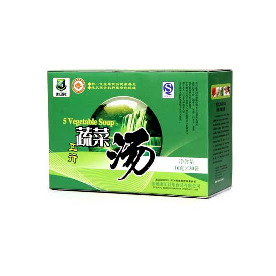 Displayed is a box of vegetable soup that is made up of multiple ingredients, including burdock, shiitake and radish. This special recipe is good for the body and can help boost metabolism. This high quality vegetable soup comes in individual bags for your convenience.