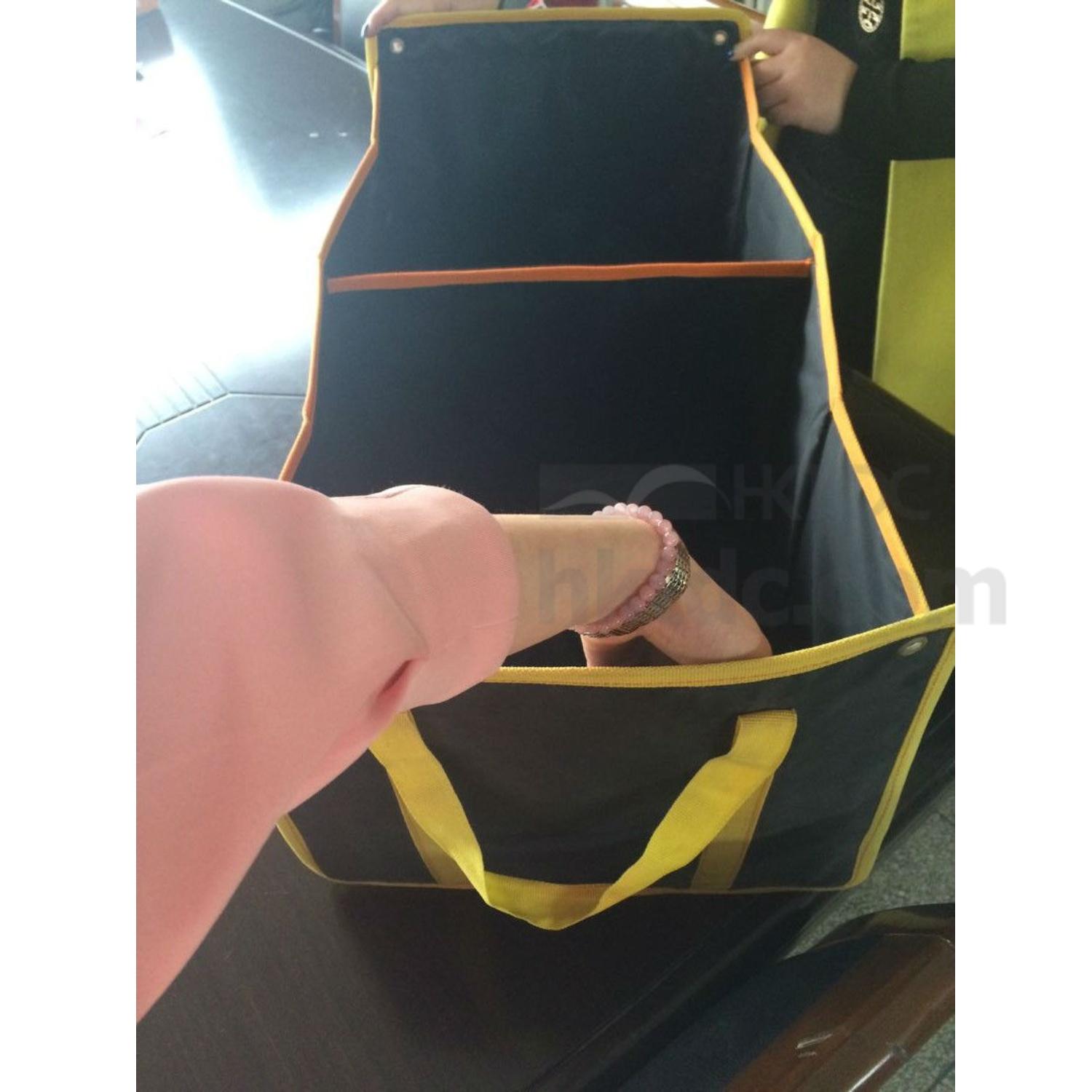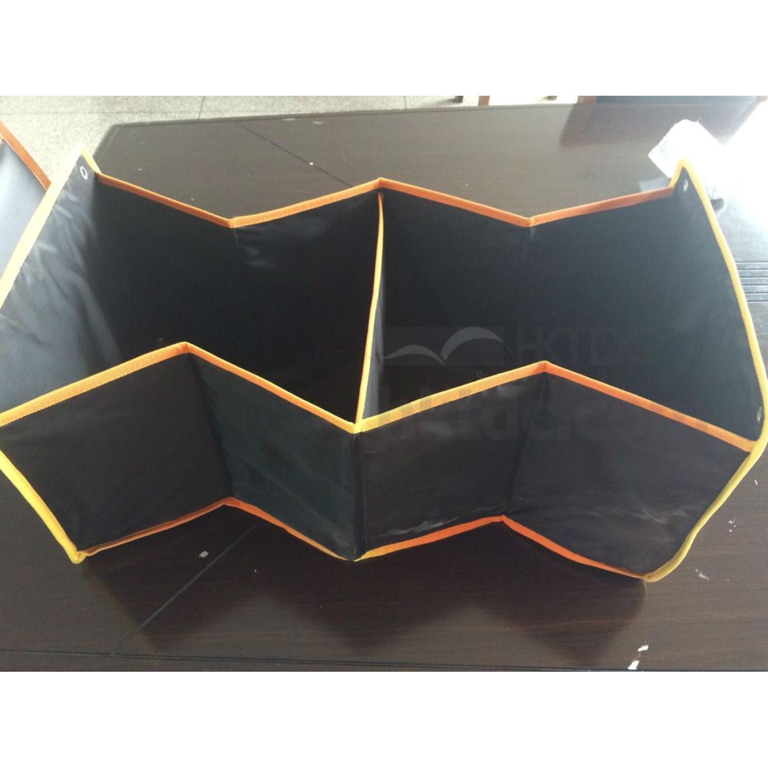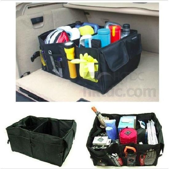 Convenient organizer fits in the trunk of any car. Container provides two large sections, one of which has an optional divider for a total of 3 possible compartments. Side pockets featured on 2 sides for additional storage. Easily folds for convenient and compact storage when container is not in use. Black or grey color, measures approximately 21" long, 10" high, and 15' wide when open.