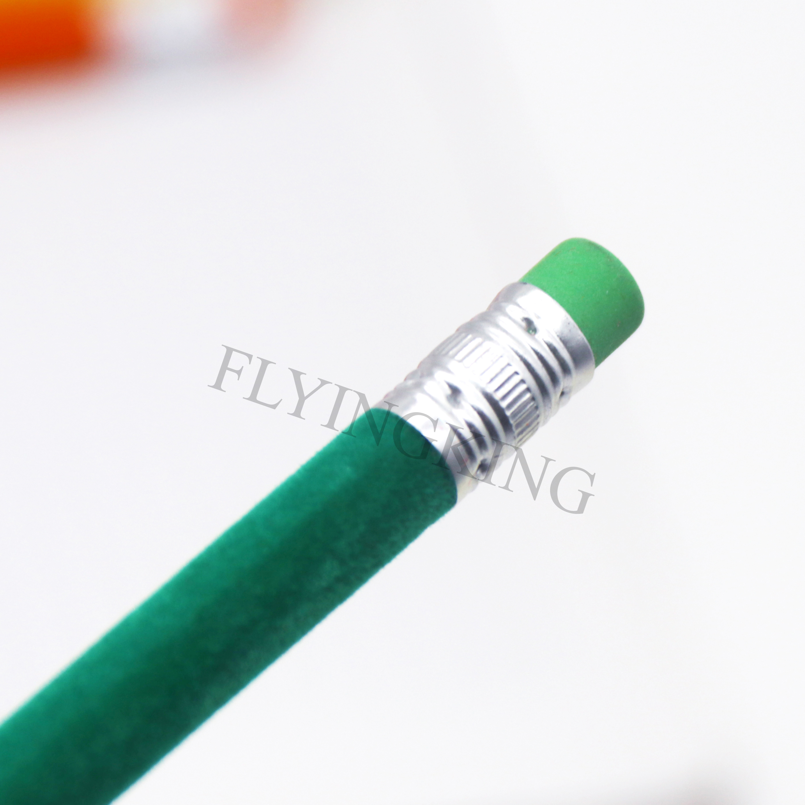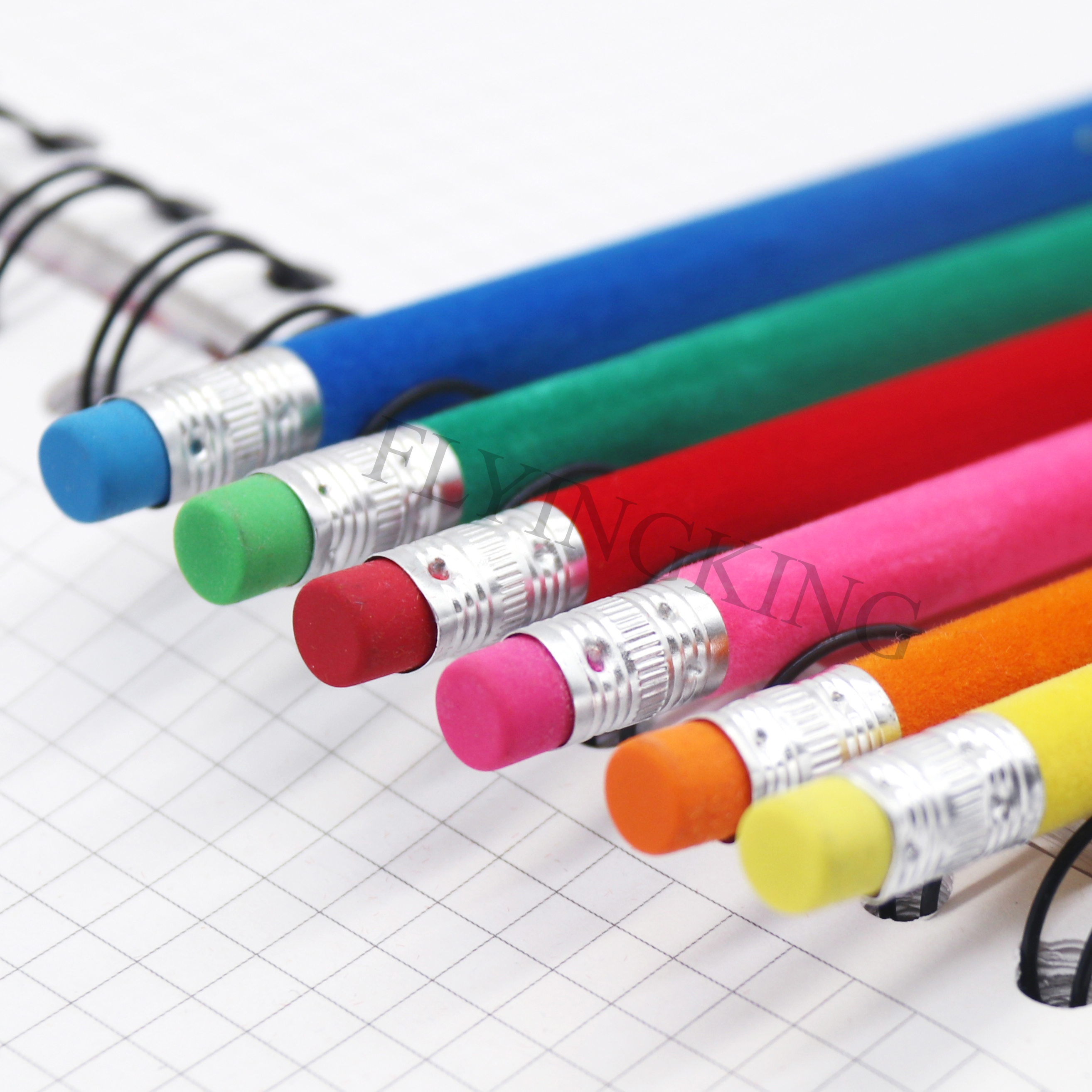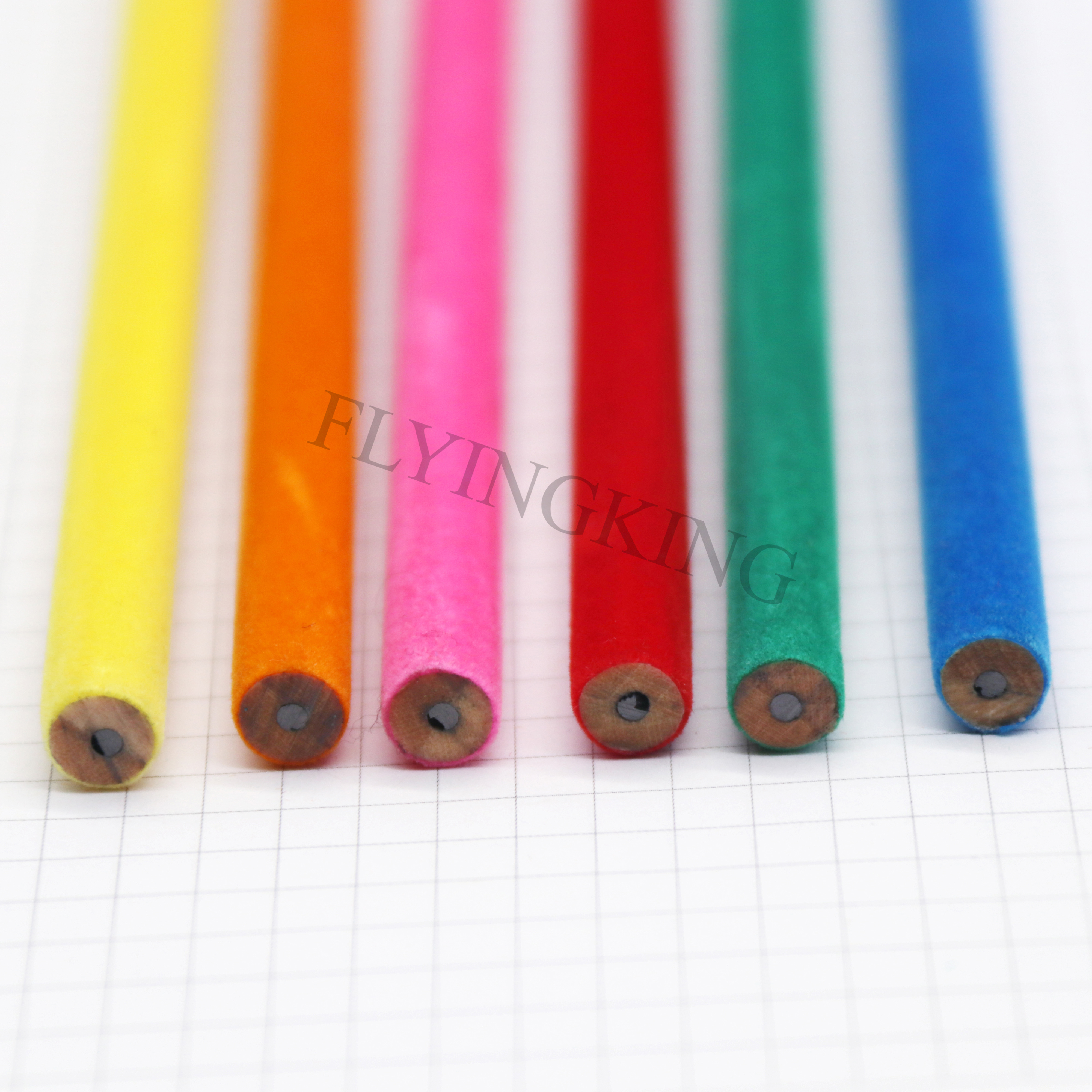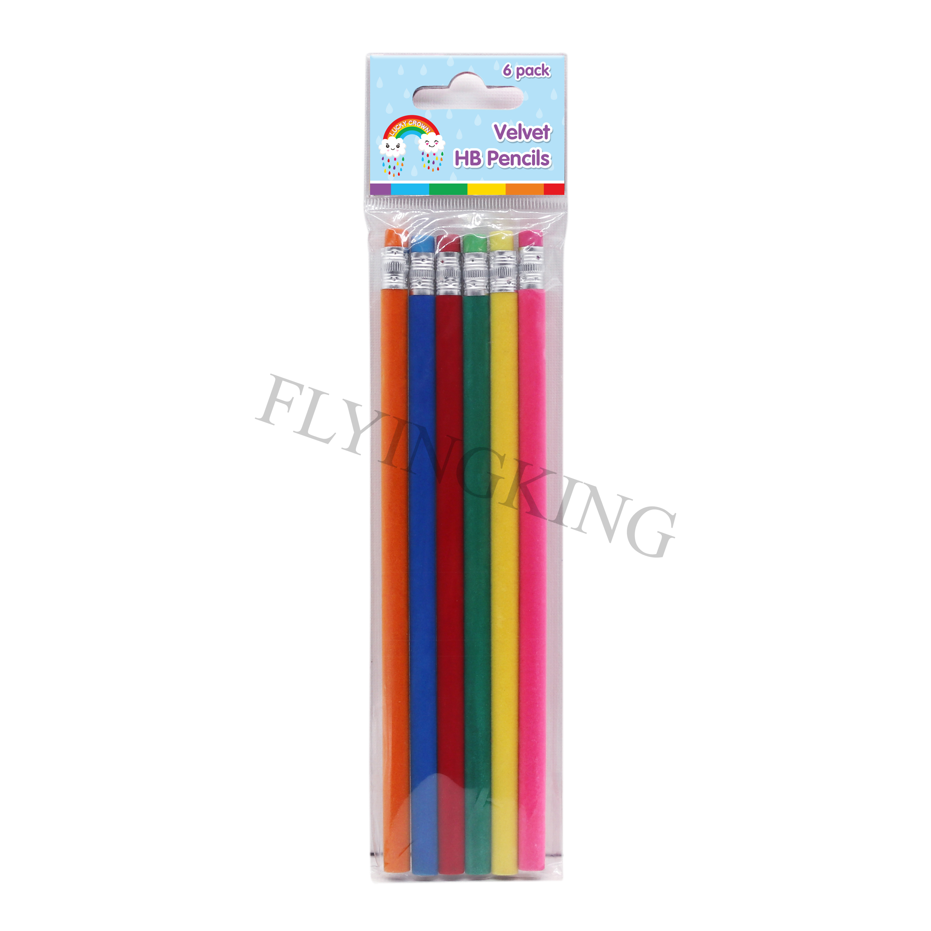 A great pack of 6 coloured HB pencils with rubber tip ends and a velvet coloured outer design.