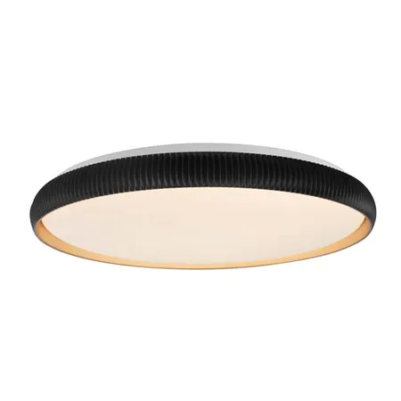 This is a circular ceiling light. The edge of the lamp body is black, with vertical stripe texture on the surface, adding visual hierarchy and texture. Inside the black edge, there is also a light yellow decorative area. The central light - emitting area can emit soft warm light. The overall style is simple yet delicate, suitable for installation in home spaces such as living rooms and bedrooms, creating a warm and stylish lighting atmosphere, fitting home decoration styles like modern minimalist and industrial styles.