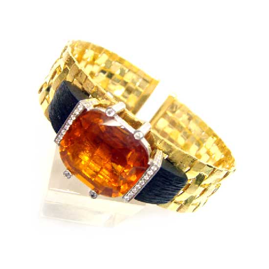 This gorgeous bangle features a brown synthetic topaz stone accented with tiny CZ stones and ebony hardwood. The band is finely made of vermeil in a woven design. The bangle can be customized in gold with diamonds upon buyers' request.
