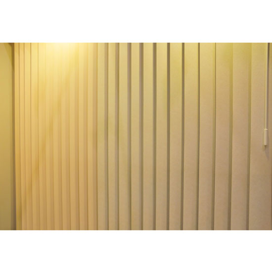 Displayed is a vertical blind made of PVC material. Its solid design imparts a brief and practical style. This piece effectively keeps bright light from transmitting to your room.