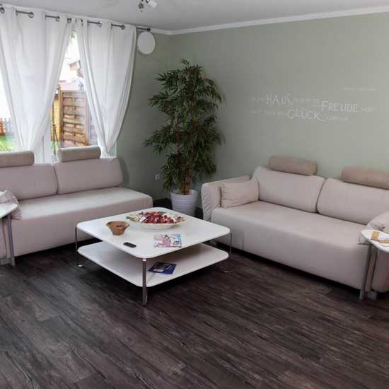 The displayed vinyl floor is durable and affordable. It features attractive wood grain with a stylish touch. It is waterproof, soundproof and anti-slip for extra functionality.