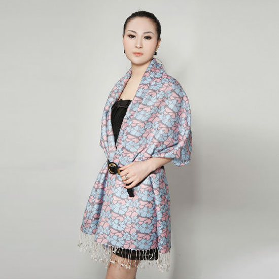 This scarf comes with floral patterns in blue and pink. It has a glossy surface that looks elegant and beautiful. Sparse tassels decorate this scarf along the hem.