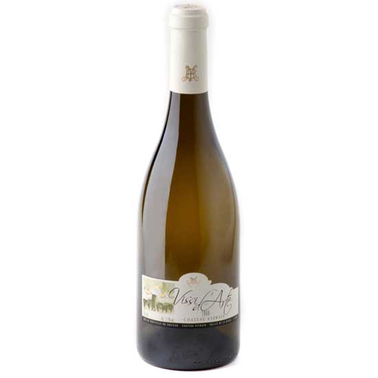 Outlined is a bottle of Vissi d'Arte white wine that comes with a fruity and dry flavor with a refreshing aroma. With a blend of sauvignon blanc and chardonnay, the taste is more astringent and complex. This sweet white wine can enhance the taste of seafood with a single slip.