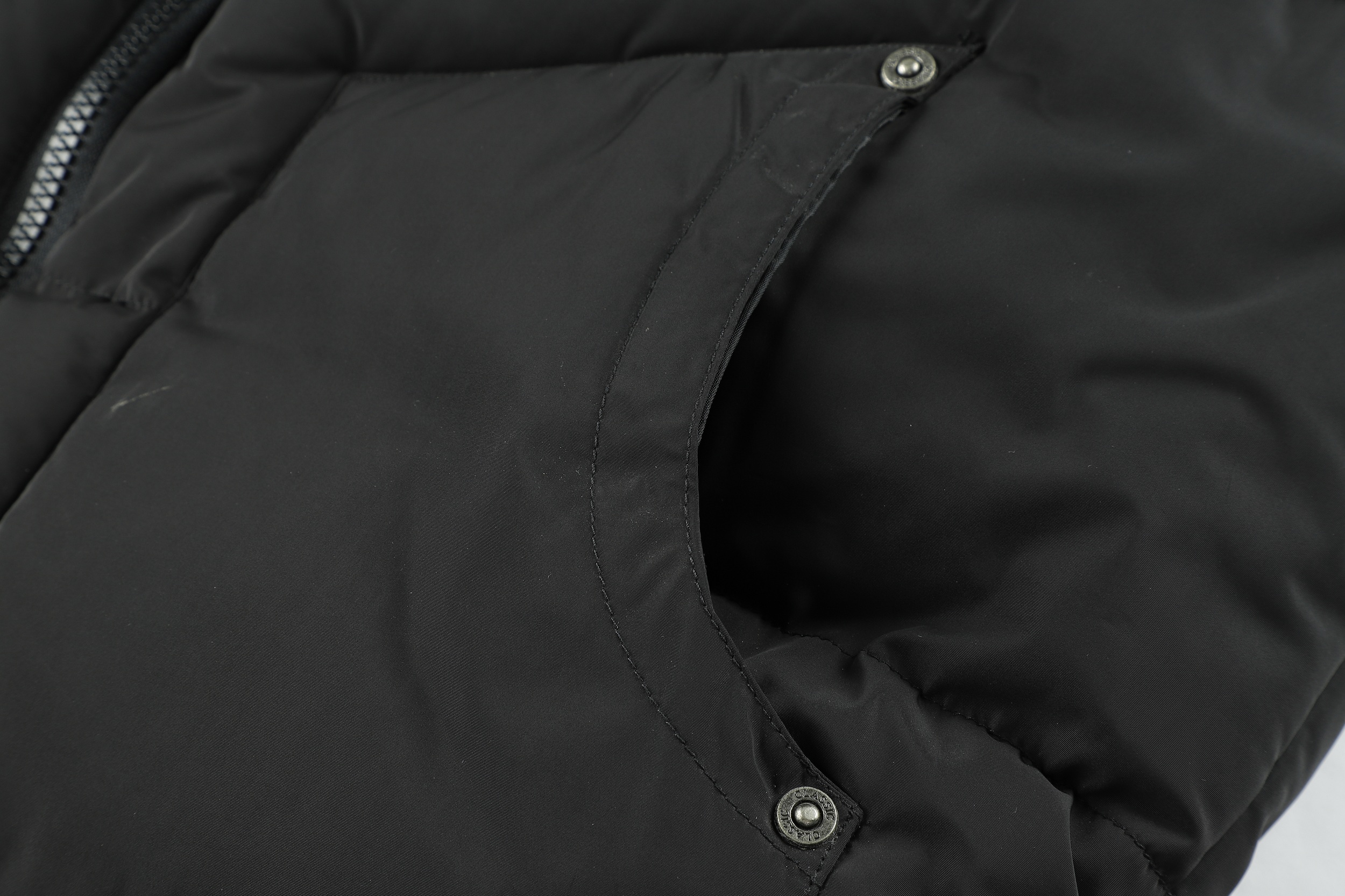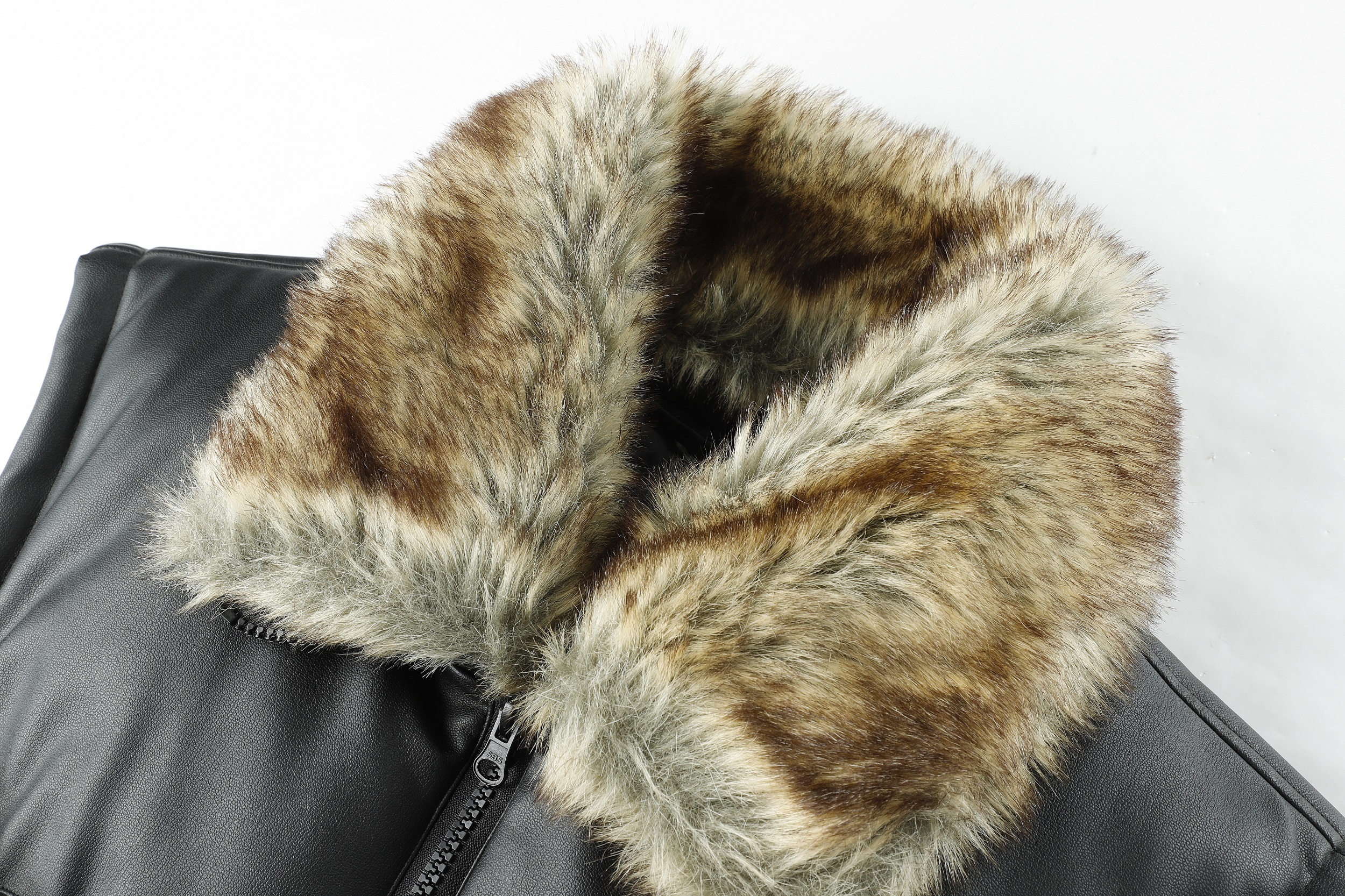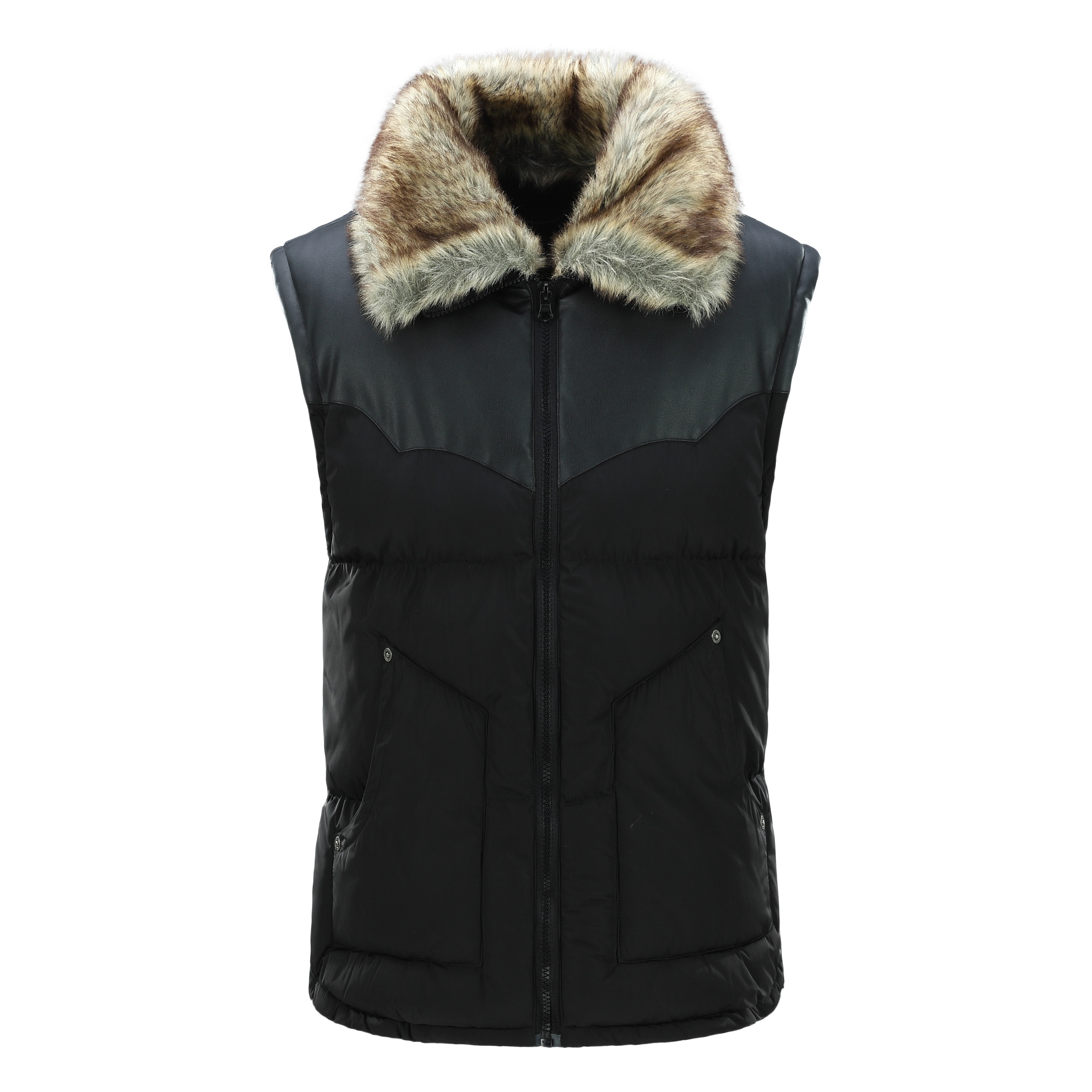 The image shows a sleeveless winter vest, primarily black in color, designed to provide warmth without restricting arm movement. The vest features a fur-lined collar, which adds a touch of luxury and additional insulation, making it ideal for cold weather. The fur appears soft and fluffy, likely providing a comfortable feel against the skin. The vest's material looks thick and durable, suggesting it is made for withstanding harsh winter conditions. The simple design, without any visible logos or patterns, makes it versatile and easy to pair with various outfits. This type of vest is practical for layering and can be worn over sweaters or shirts for extra warmth during the colder months.
