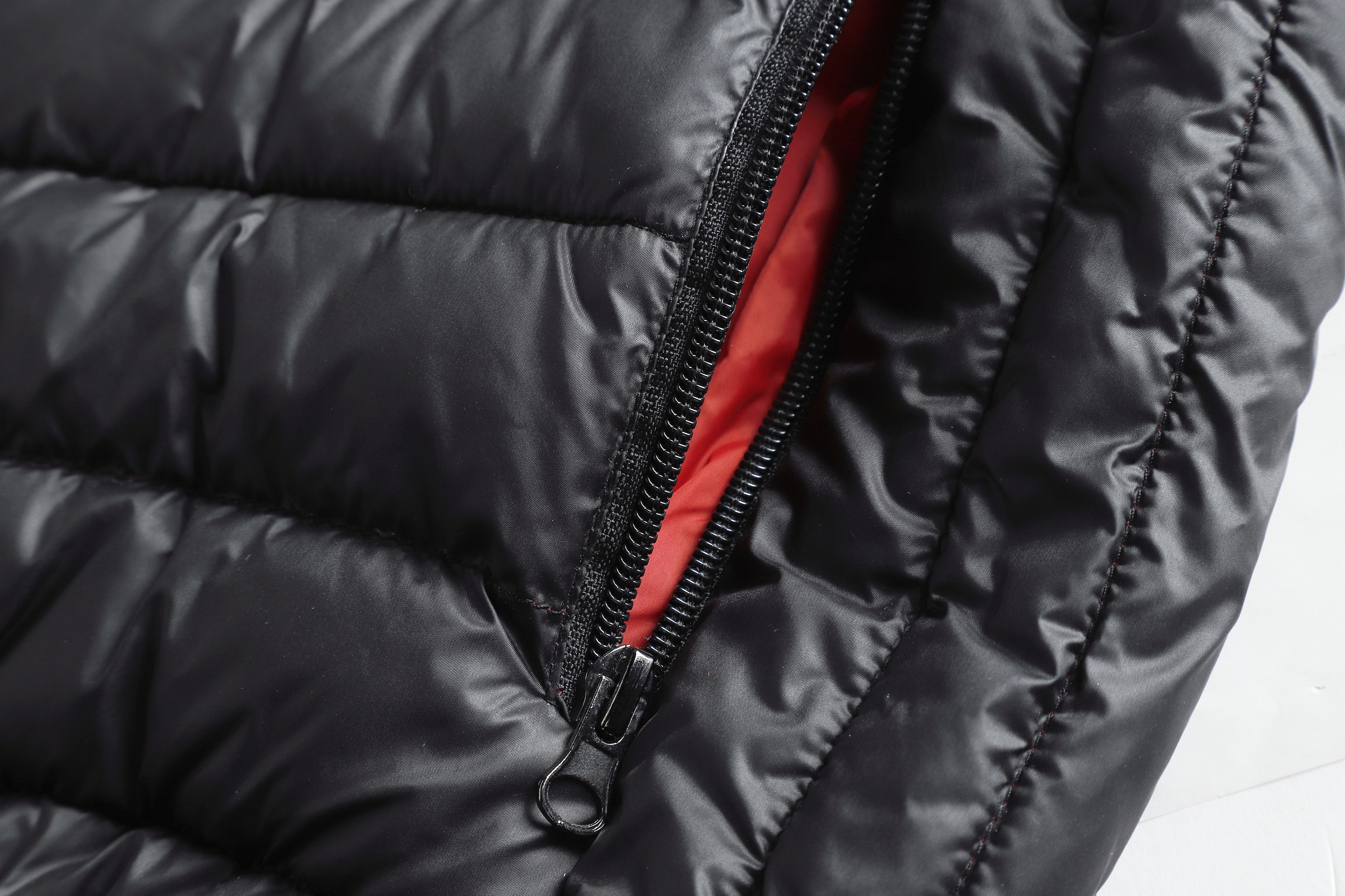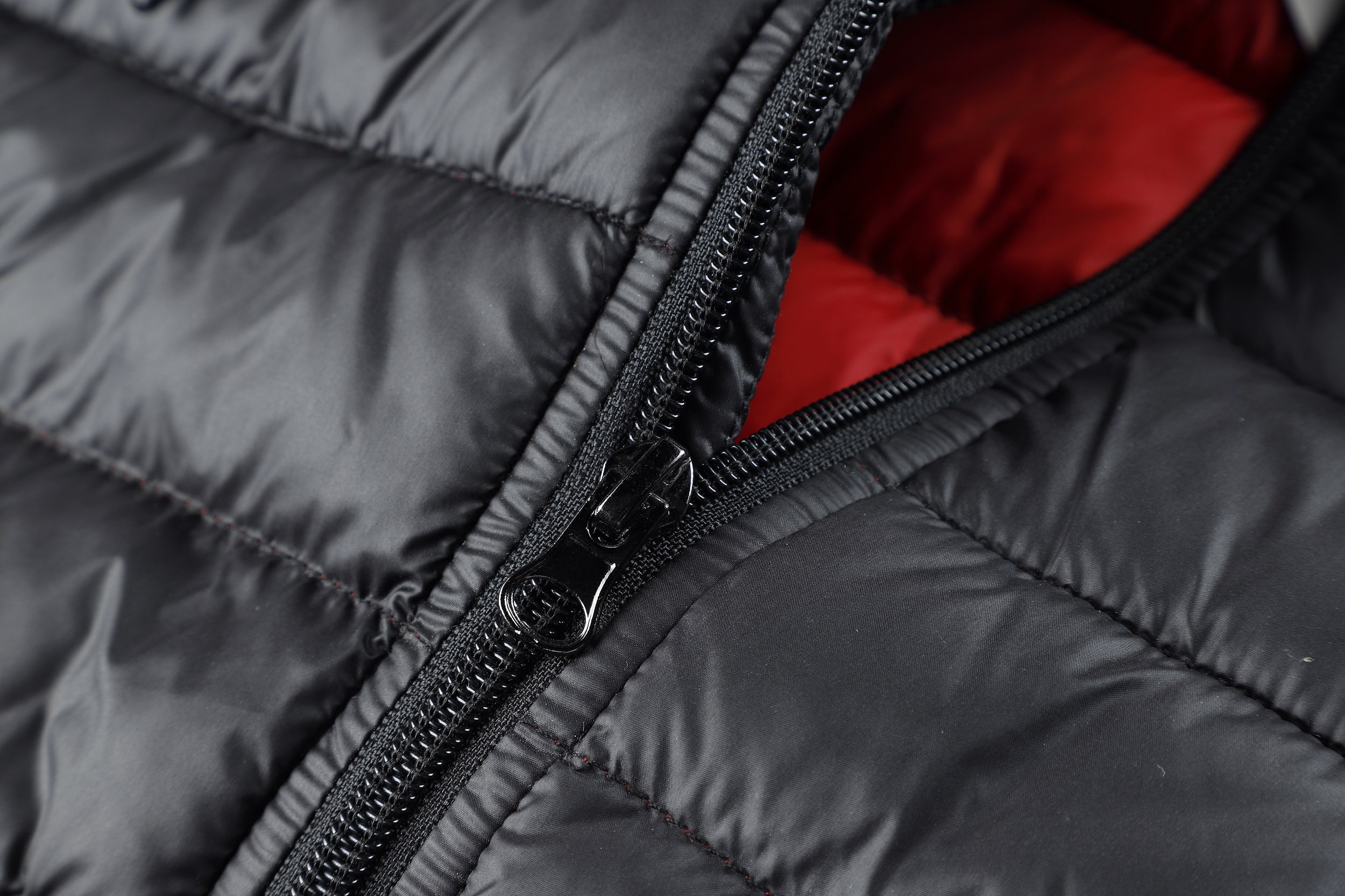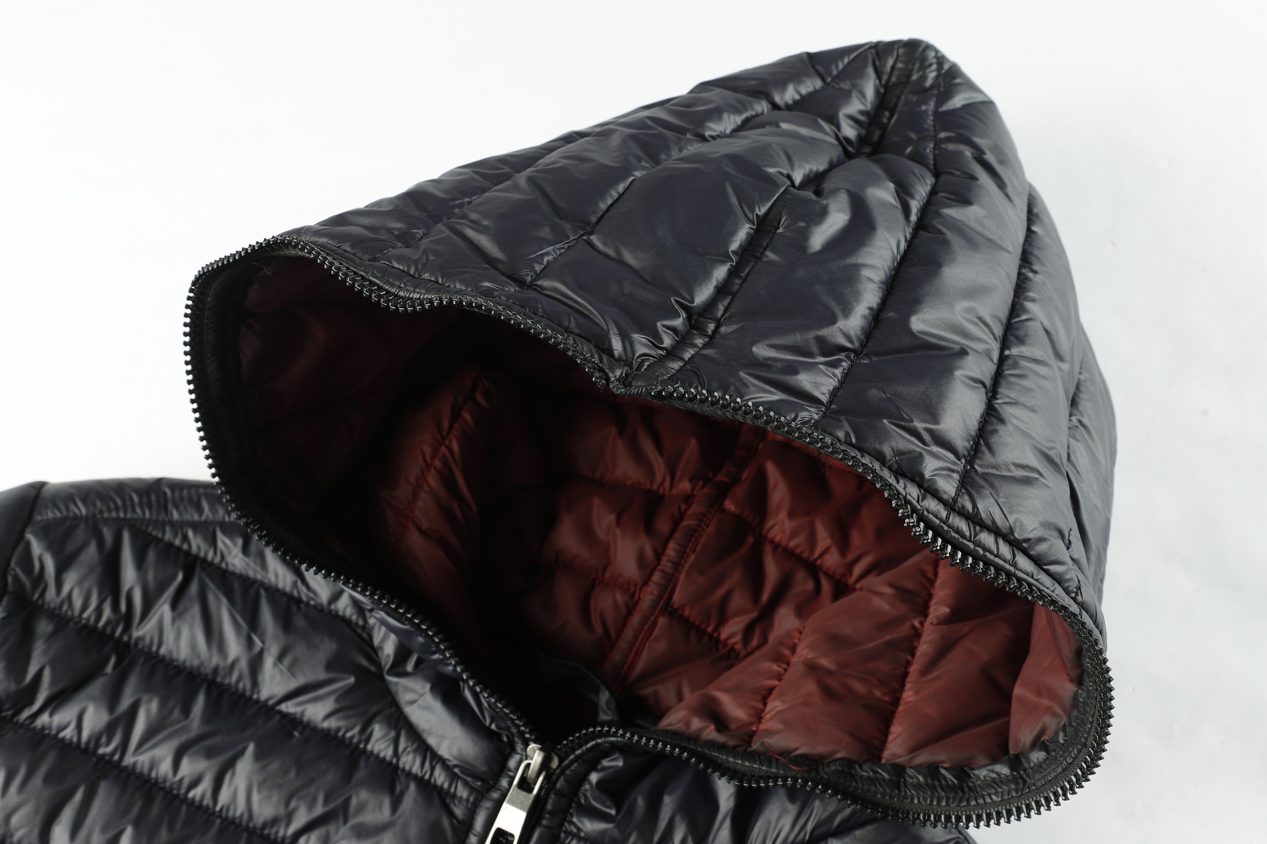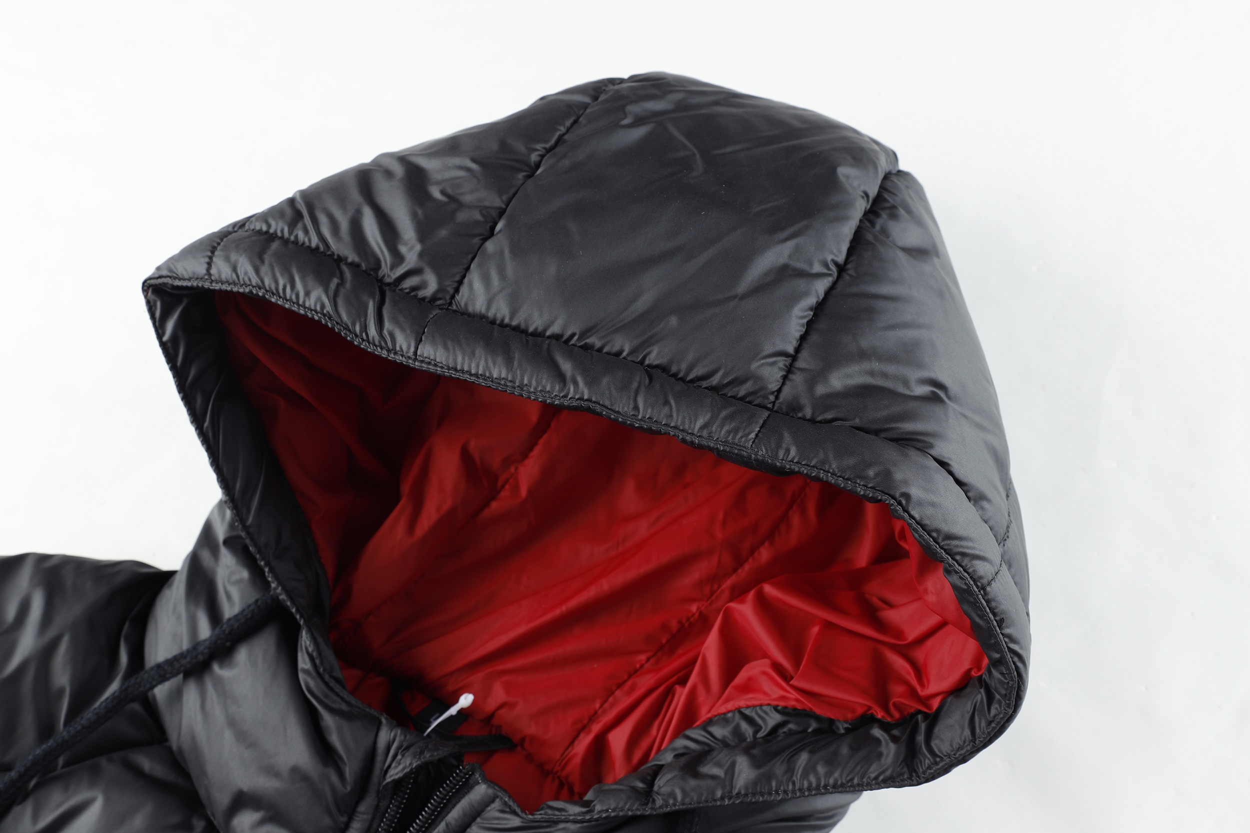The image displays a black puffer jacket with a zippered front, designed for warmth and comfort. The jacket features a hood with a contrasting red interior, adding a pop of color to the otherwise monochrome piece. The material appears to be quilted, which is typical for insulation in cold weather apparel. The jacket includes pockets, likely zippered for secure storage, and the cuffs seem to be elasticized to keep the cold out. The overall design is streamlined and functional, suitable for casual wear or outdoor activities in chilly conditions. The jacket's style suggests it could be unisex, appealing to a wide range of consumers seeking practical and stylish winter clothing.