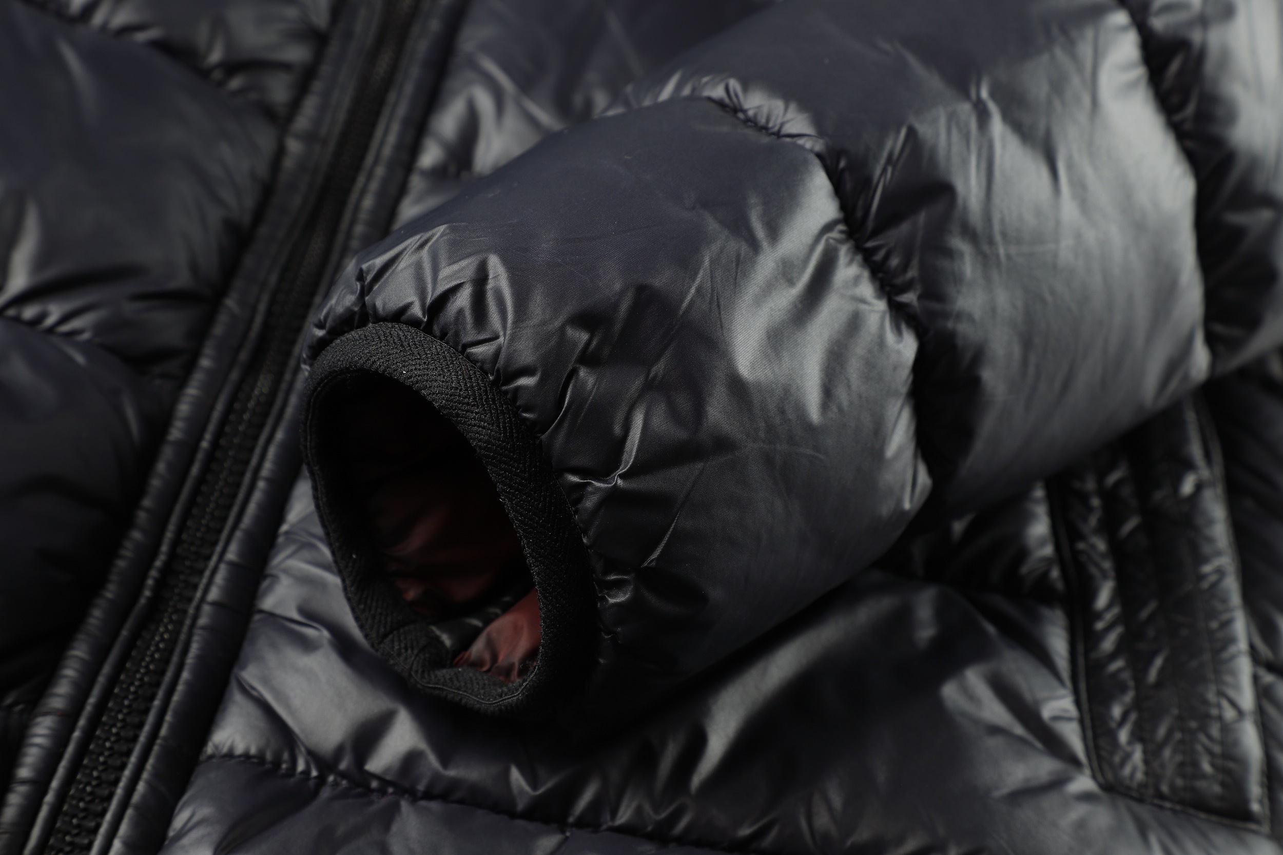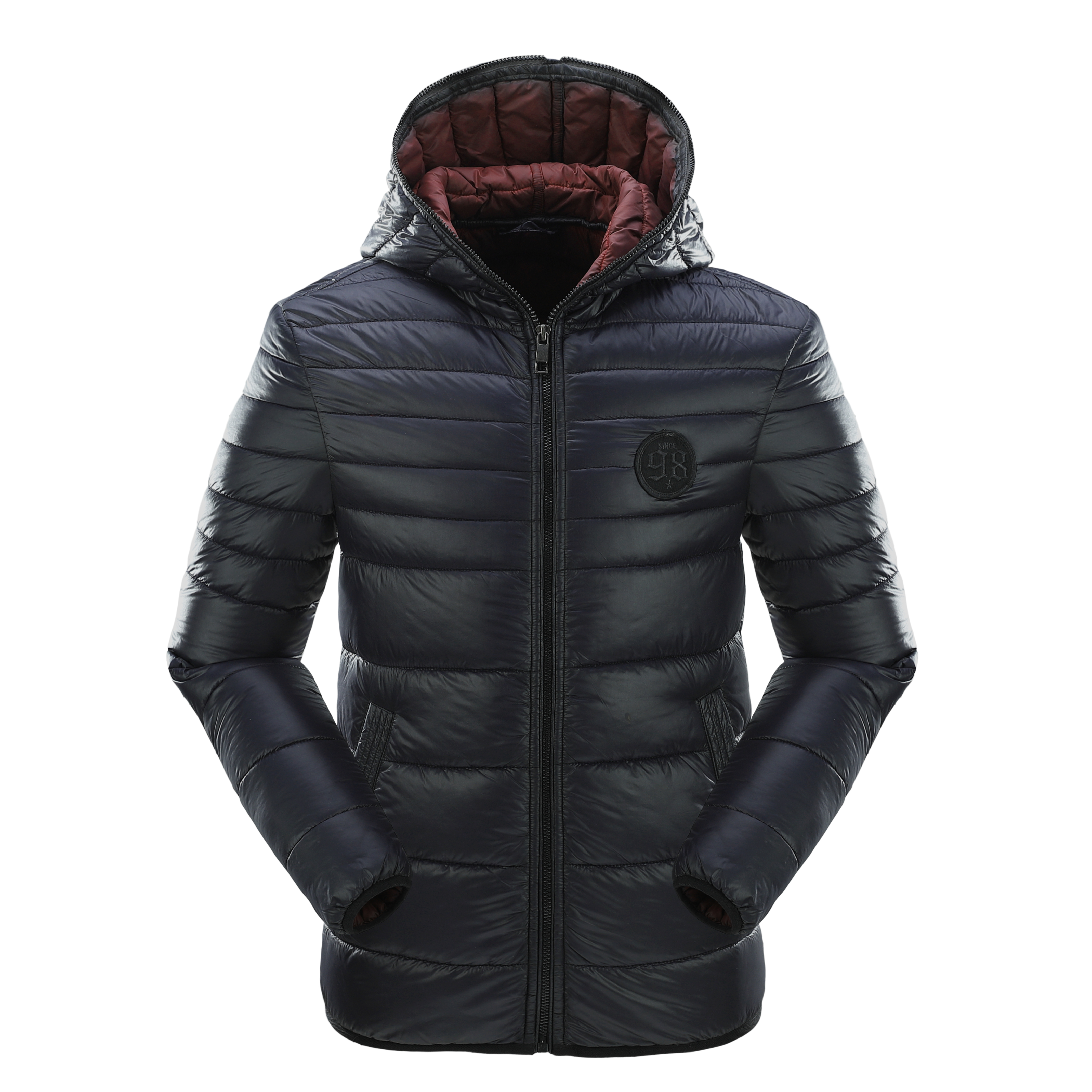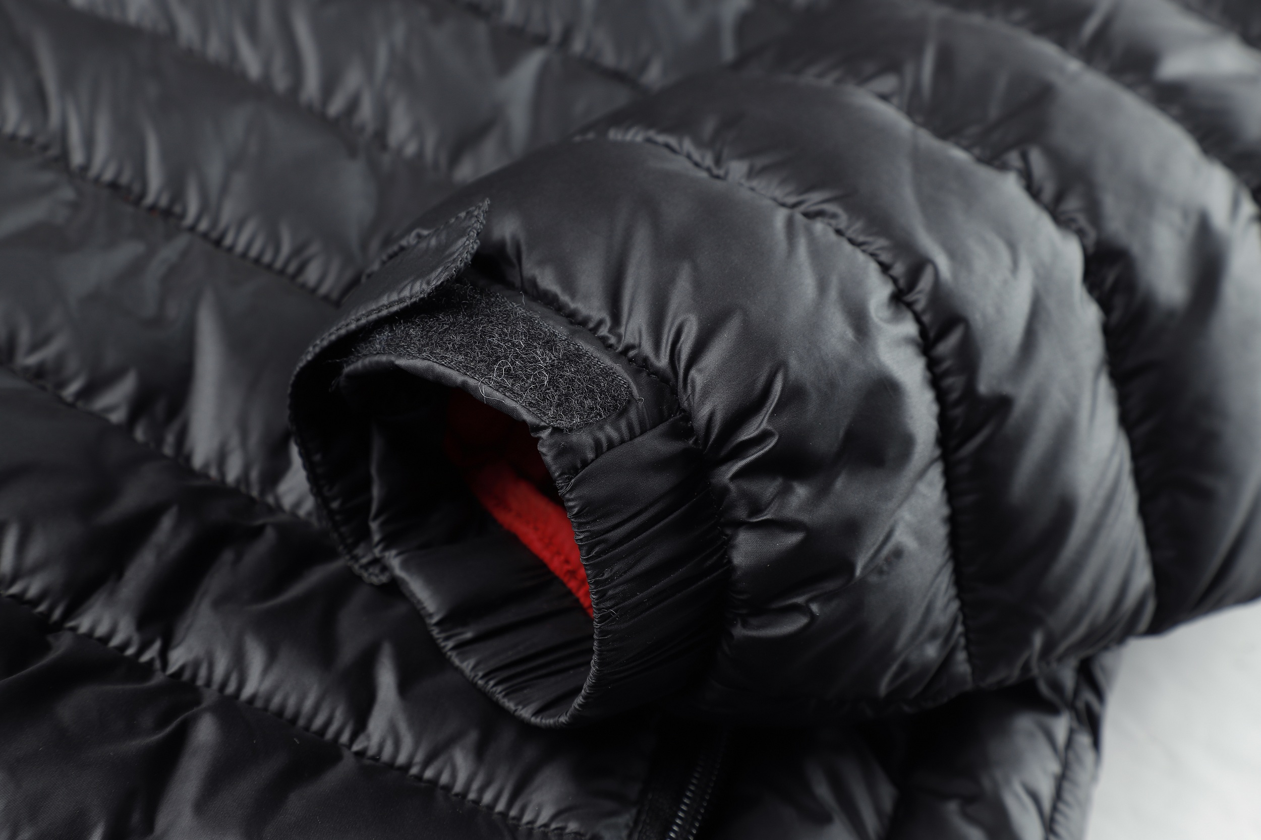 The image displays a black puffer jacket with a zippered front, designed for warmth and comfort. The jacket features a hood with a contrasting red interior, adding a pop of color to the otherwise monochrome piece. The material appears to be quilted, which is typical for insulation in cold weather apparel. The jacket includes pockets, likely zippered for secure storage, and the cuffs seem to be elasticized to keep the cold out. The overall design is streamlined and functional, suitable for casual wear or outdoor activities in chilly conditions. The jacket's style suggests it could be unisex, appealing to a wide range of consumers seeking practical and stylish winter clothing.