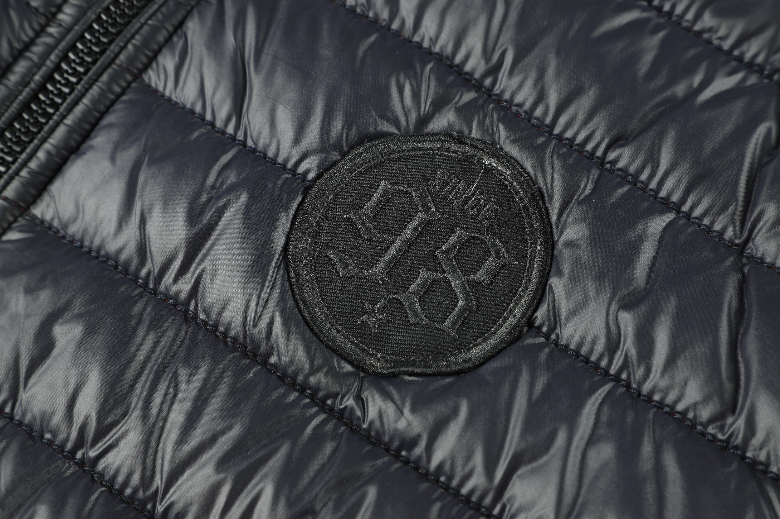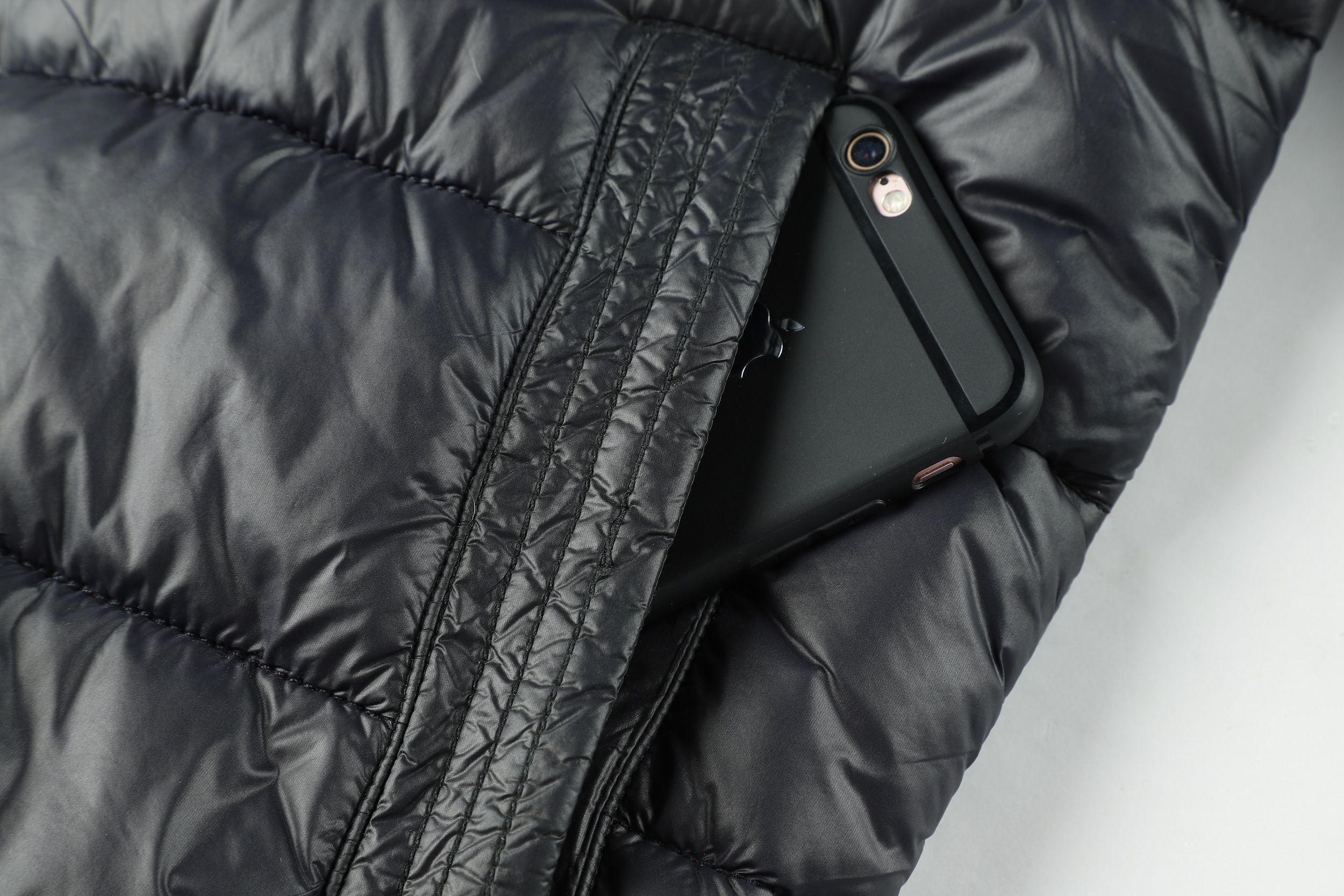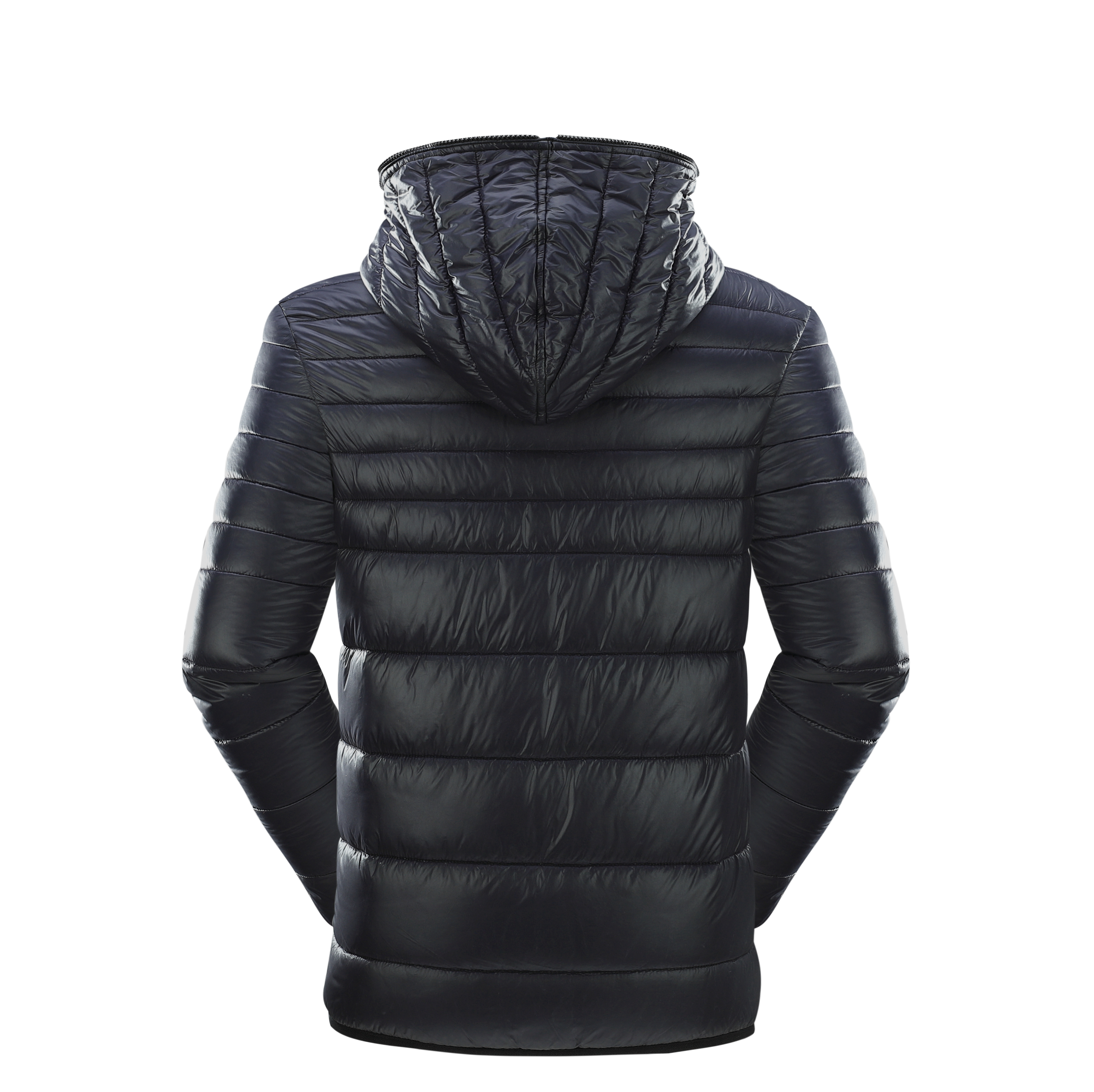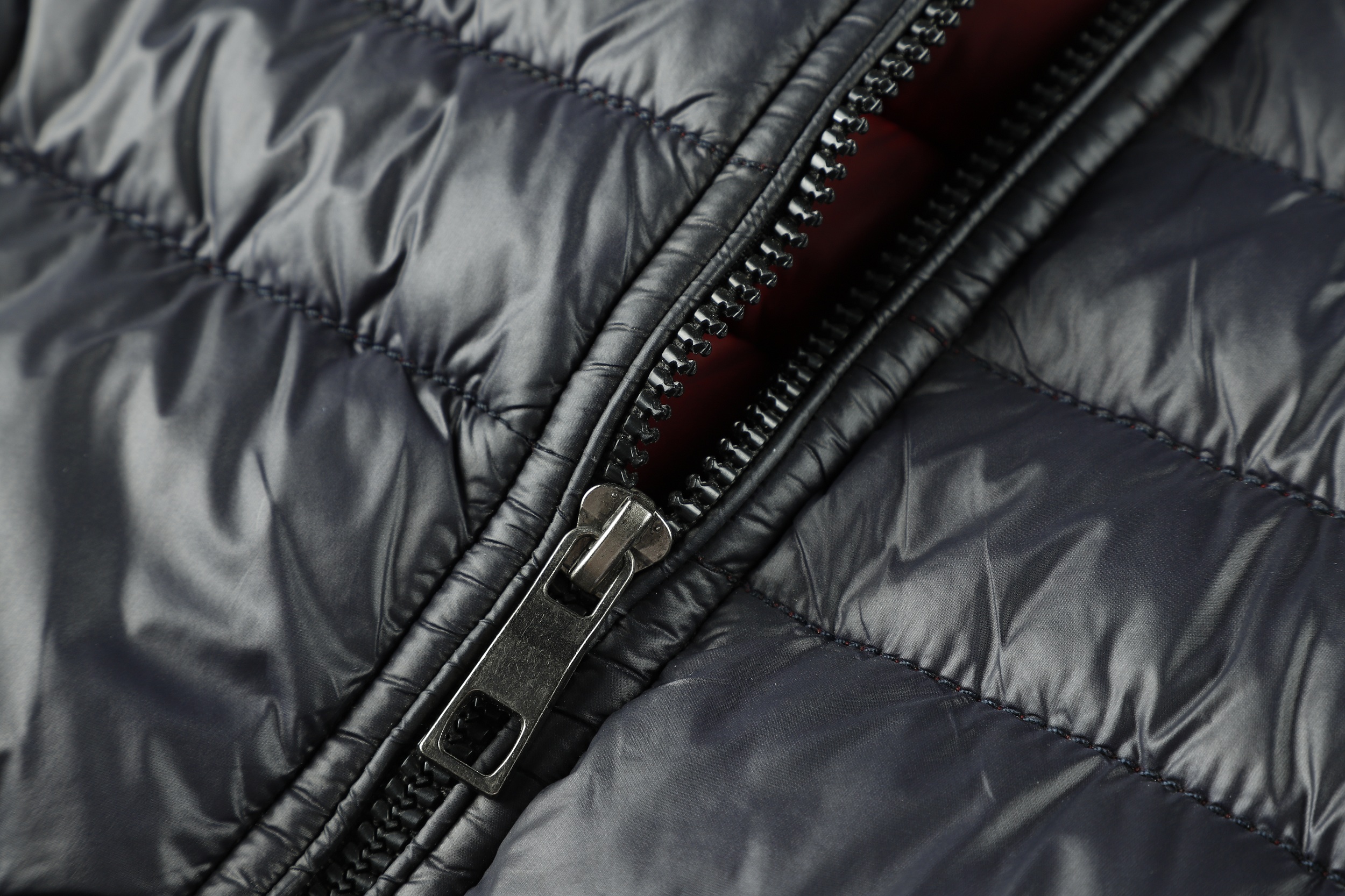 The image displays a black puffer jacket with a zippered front, designed for warmth and comfort. The jacket features a hood with a contrasting red interior, adding a pop of color to the otherwise monochrome piece. The material appears to be quilted, which is typical for insulation in cold weather apparel. The jacket includes pockets, likely zippered for secure storage, and the cuffs seem to be elasticized to keep the cold out. The overall design is streamlined and functional, suitable for casual wear or outdoor activities in chilly conditions. The jacket's style suggests it could be unisex, appealing to a wide range of consumers seeking practical and stylish winter clothing.