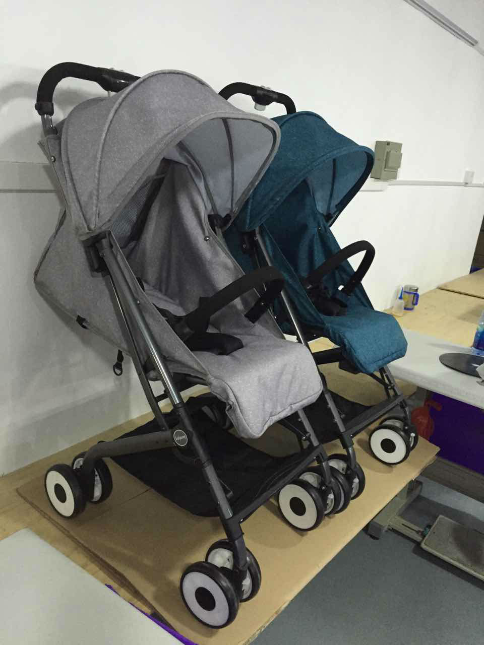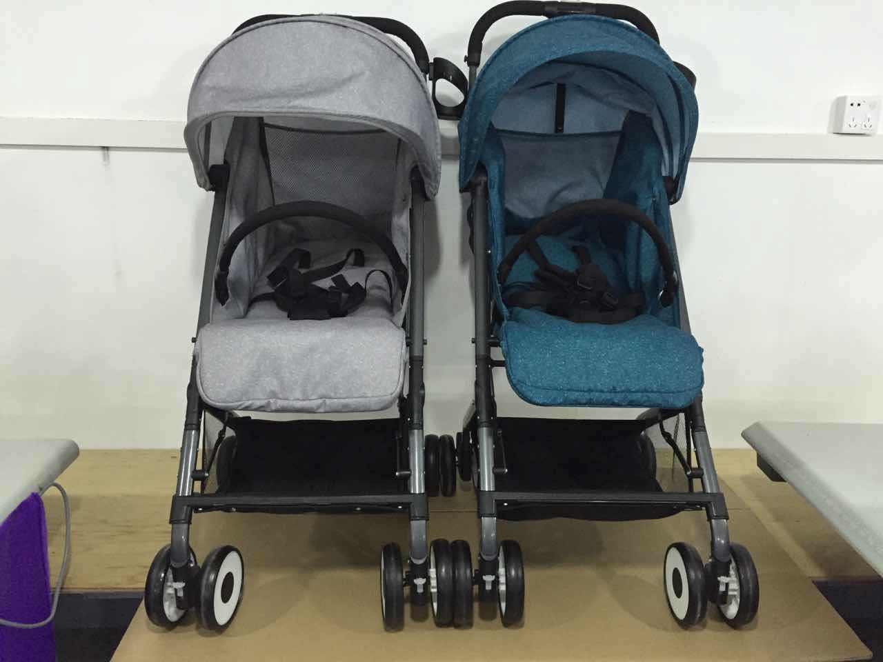 Five point shoulder belt buckles,the cushion is Linen cloth, the canopy is knitted fabric,three pieces of canopy,this stroller with shopping basket