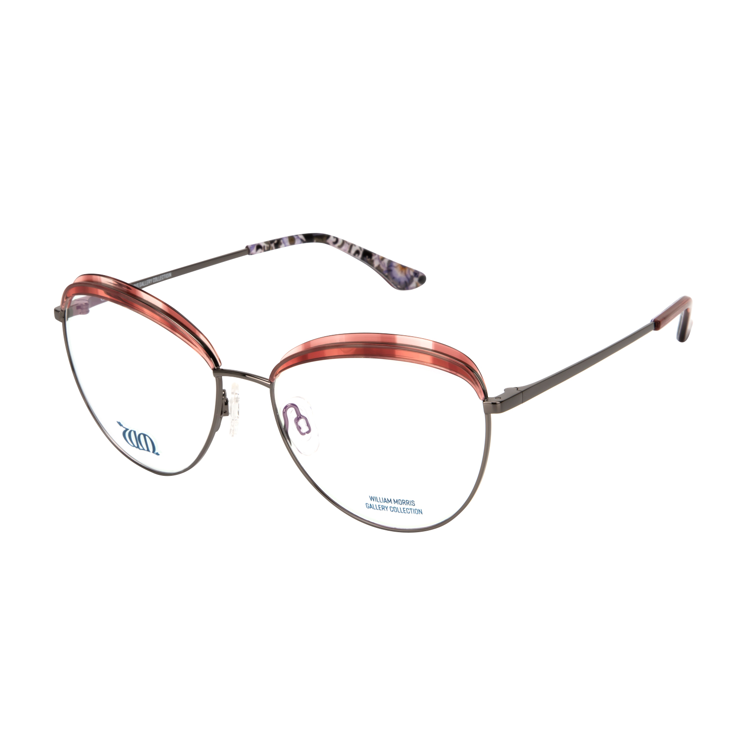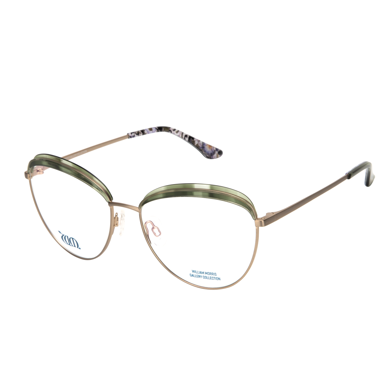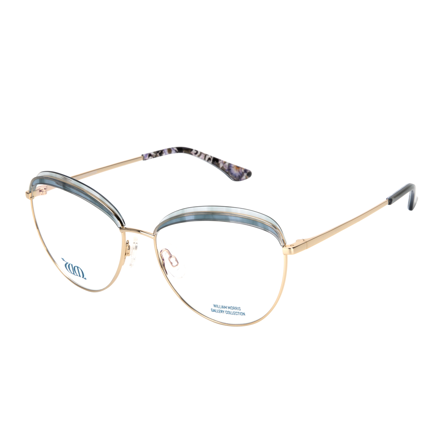 Lodden features a protruding acetate brow line with a cat-eye flair makes for an intriguing throwback style. Combined with a mixture of shiny metallic and brushed matt that compliments the gradients within. An intricate coating upon the temple tips of scrolling flowers and foliage of gold, greens and silver grey. The Lodden print sits perfecting amongst the colours that were designed by William Morris and was later adapted as a wallpaper design and rug.