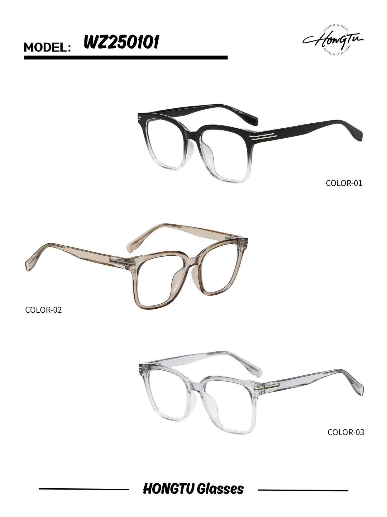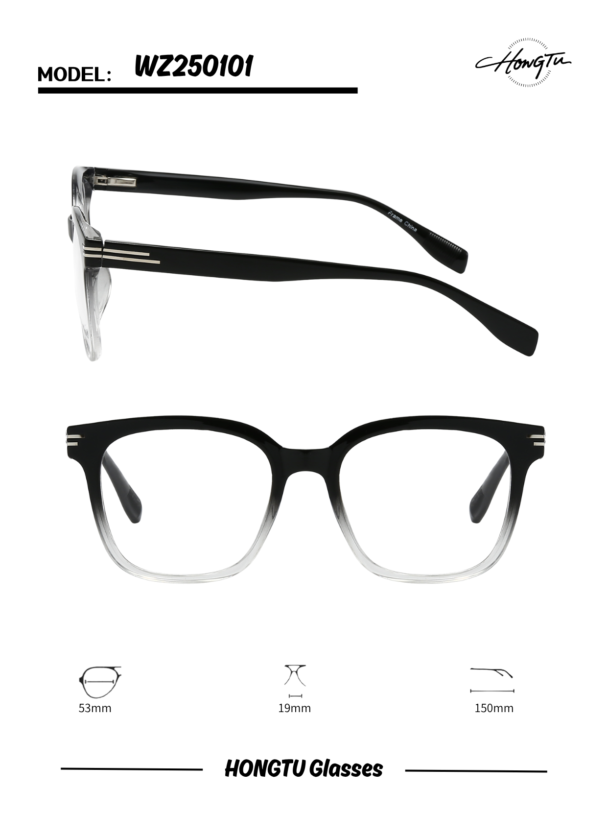 The HONGTU Glasses Model WZ250101 combines contemporary styling with extended comfort. Available in three versatile color options (COLOR-01 to COLOR-03), this model is designed for all-day wear. With a 53mm lens width, 19mm bridge, and 150mm temple length, it offers a balanced and secure fit. Ideal for those seeking a blend of modern design and lasting comfort.
