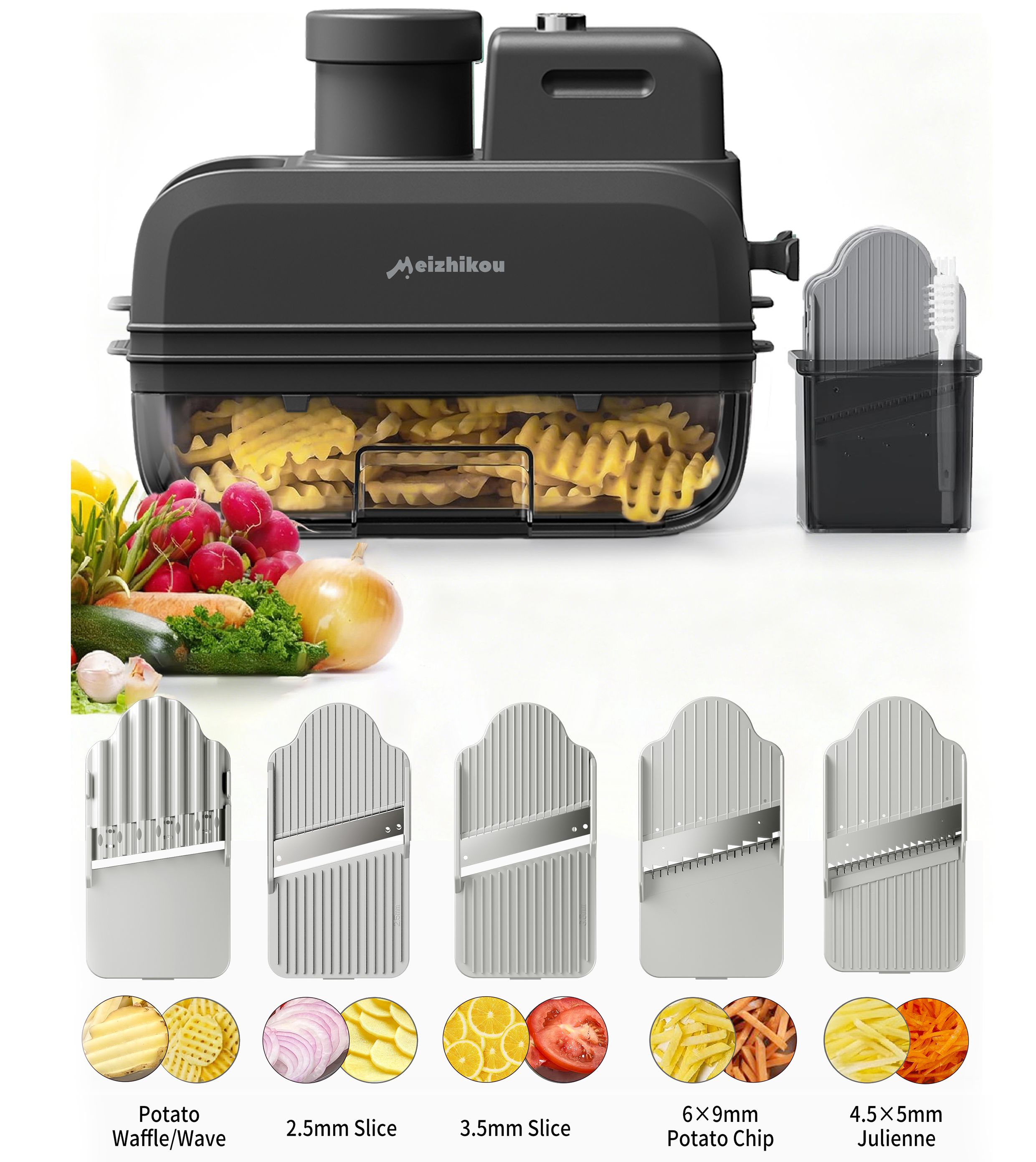 Makes waffle fries, regular chips, vegetable slices & wave-cut shapes—one tool for diverse snacks!