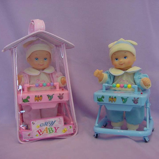 Displayed is a baby doll in a toy baby walker. The little doll dresses similar as your little baby at home. Let your little one enjoy some walk-learning fun with this lovely doll.