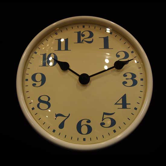 This featured wall analog clock boasts a simplistic vintage design with a sepia yellow dial and a white rim. Numeral markers in grayish blue are designed in classic fonts. This subtle yet stylized clock is a delightful choice for your home and office.