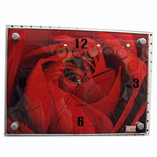 Featured is a stunning wall cock with a flat rectangular glass plate lens. The remarkable rose background easily captures attention. With a quartz movement, this sophisticated clock is perfect for precision time-keeping while adding spice to your home.