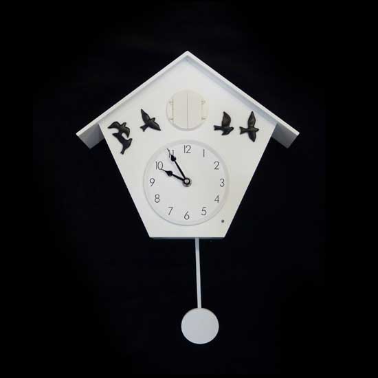 This is a stylish analog wall clock made of high quality MDF material which is stronger and denser than normal particle board. It is designed to look like a house and decorated with black bird-shaped pieces for added style. This elegant pendulum clock is an excellent addition to your home.