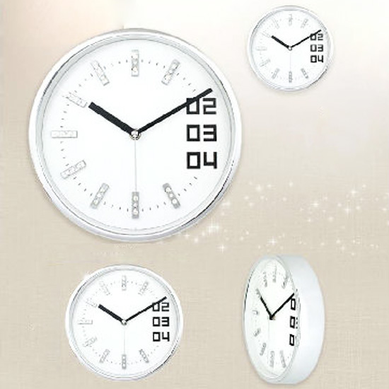 This is a wall clock with a round casing in white with a silvery rim. It is decorated with sparkling stone elements on sticker markers for a sparkling look. The black Arabic numbers add a touch of uniqueness to this design.