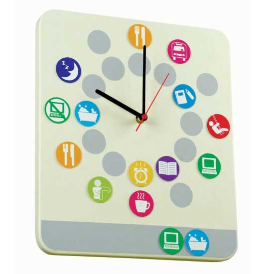 The square children's wall clock features magnets with regular daily activity patterns. It is constructed of high-quality steel. This wall clock complements the decor of your children's room.