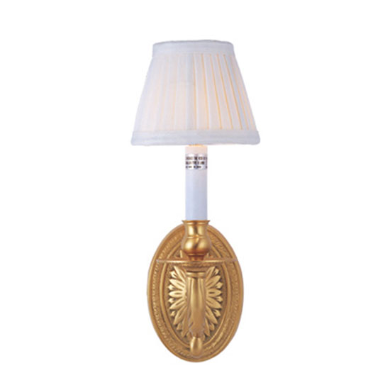 This enticing wall lamp comes with a white shade with pleated details. It is complemented with an oval wall plate in a glossy golden hue. This refined wall lamp is great for indoor decoration.