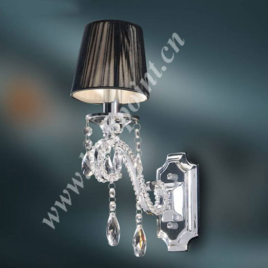 This is a wall lamp featuring a cone-shaped lampshade with a black finish. It is adorned with crystal decorations for a sophisticated and attractive look. With a well-made mounting base, this lamp is easy to install.