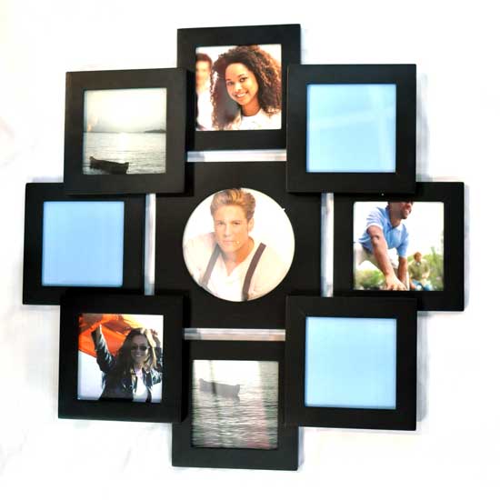 This contemporary wall photo frame set features a beautiful combination of nine sleek rectangular-shaped photo frames, occupying a large wall area. The frame at the center comes with an oval-cut photo window for a unique touch. Showcase your cherished photos with this deluxe wall photo frame set.