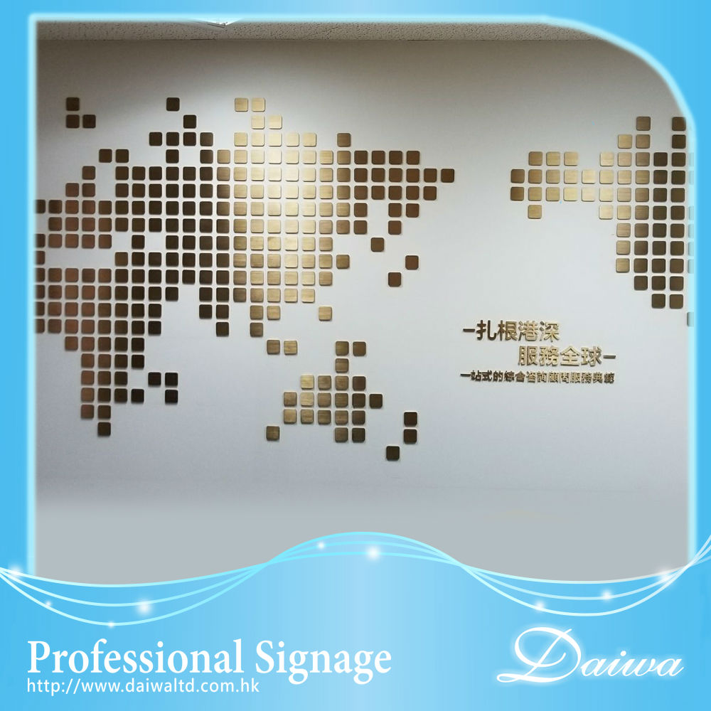 The featured wall sign comes in a pixel map design and is constructed of metallic tiles in gold tone. It features brushed, clean cut graphics and is matched with inspirational messages. This wall sign can be used for customized lobby company logos and is ideal for decorating the walls on the reception areas.