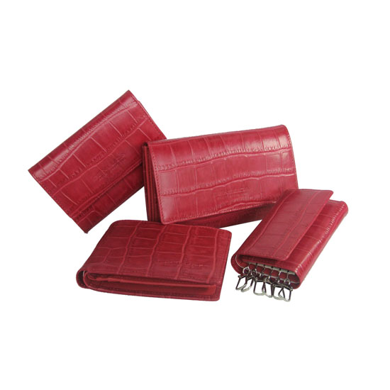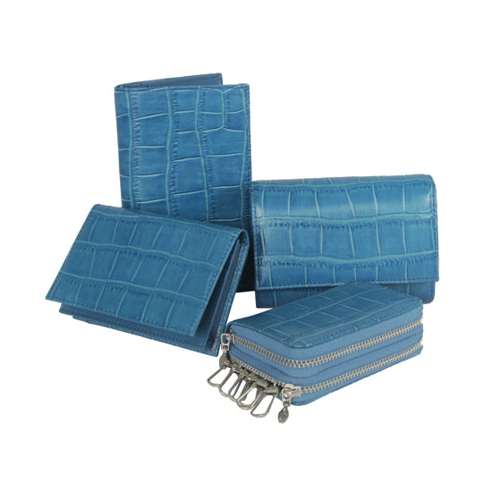 The wallets and key wallets are made out of croco-printed leather. The items exhibit delicate scales and stitched details. They are also available in different colors.