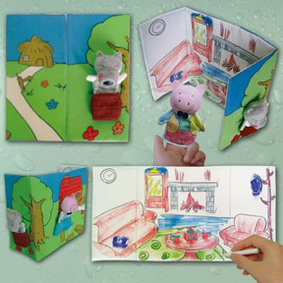 The washable coloring finger playset features the theme of the "three little pigs". This is a real instantly rinsed washable coloring finger playset with washable finger puppets to play. You can color with the non-toxic washable coloring markers and the coloring book can be instantly rinsed without any detergent or washing machine.