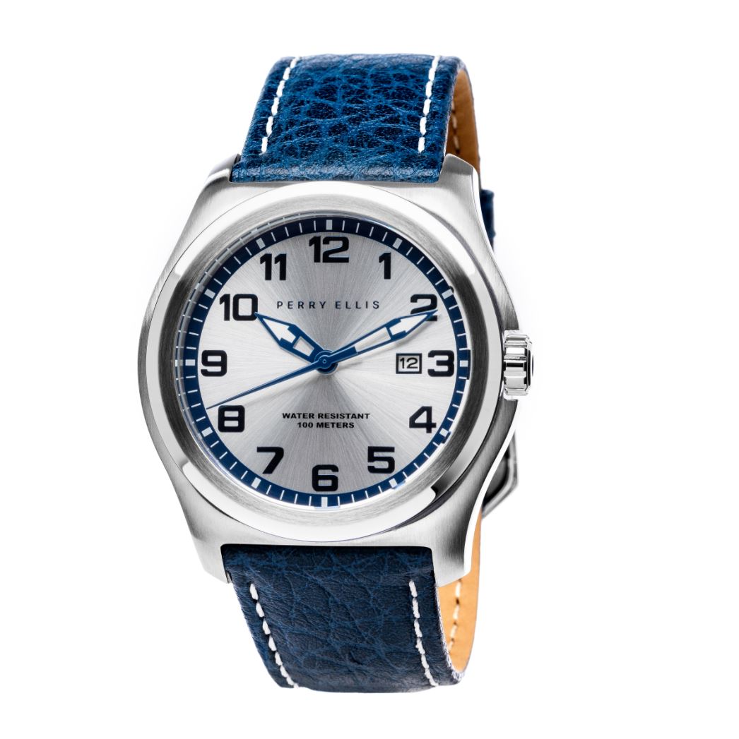 The pictured mens’ watch has a silver sunray dial and is equipped with a quartz movement. It has numeral hour markers and has three hands to show the time. This watch offers reliable precision and has a leather strap for comfortable wearing.