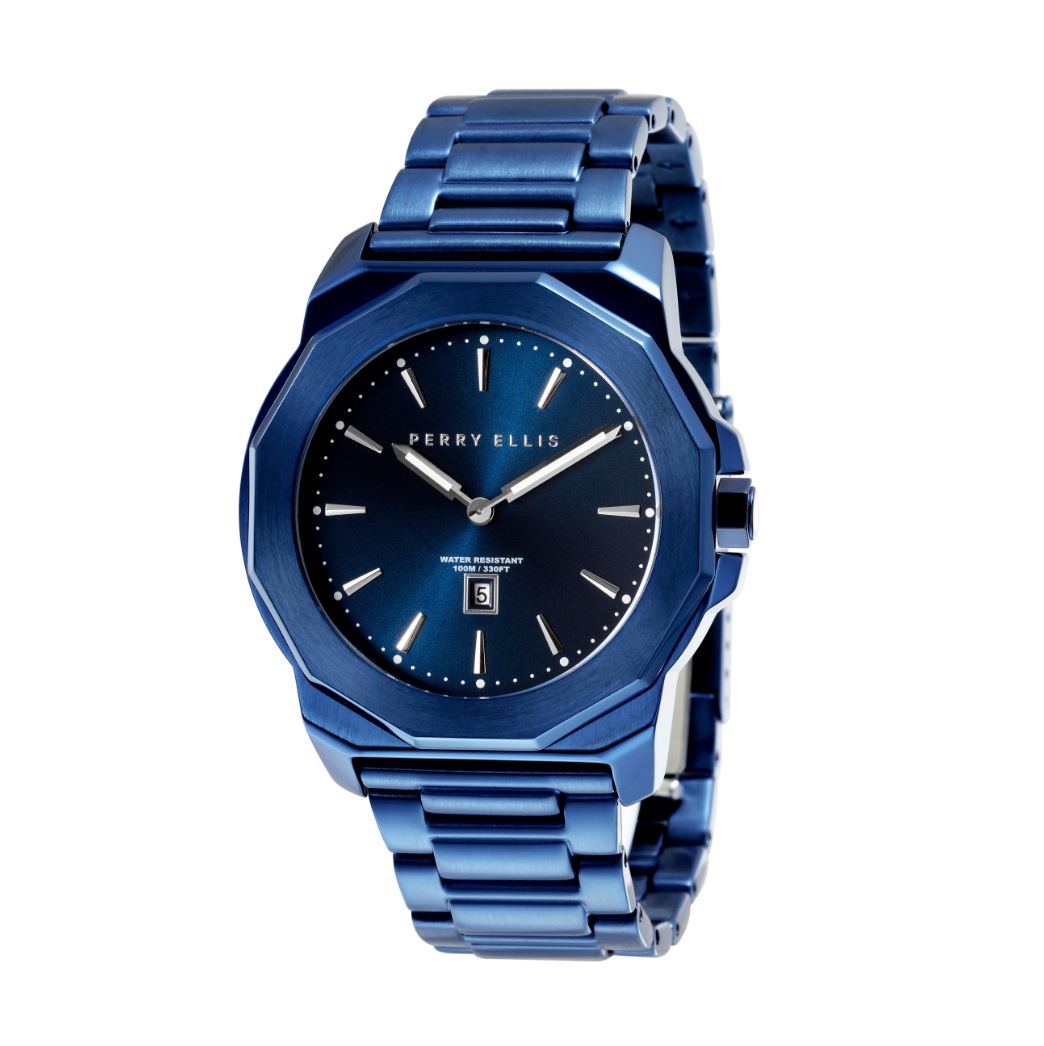 The displayed watch comes in a stylish unisex design and has a durable stainless construction. It has a dodecagon case with a round blue sun ray dial. This watch has two hands with baton hour indexes and has a date window at 6H position. It is perfect for complementing your look and delivers remarkable precision.