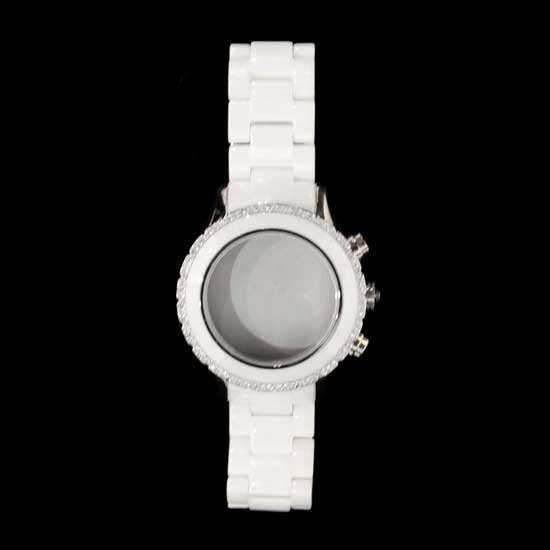 This is a fashionable watch case that is finely crafted with exquisite details. It is accented with dazzling stones in a silvery color. The three crowns on the left side of the case offer added utility.