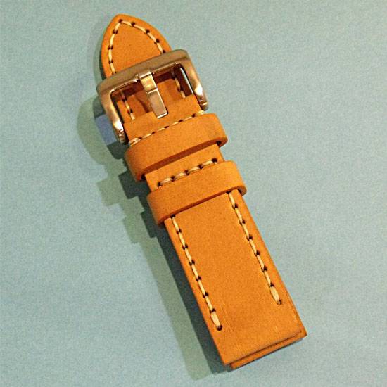This watch strap is crafted with cow leather for extended durability. The fine stitching details bring a sophisticated touch to the design. It is attached with a steel buckle for a secure fit.