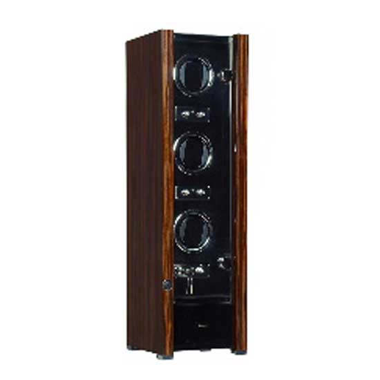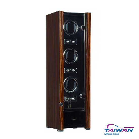 The displayed watch winder features a wooden exterior with delicate grain for a touch of uniqueness. This elongated box holds three watches at a time. This cubic watch winder boasts rugged construction and first-rate durability.
